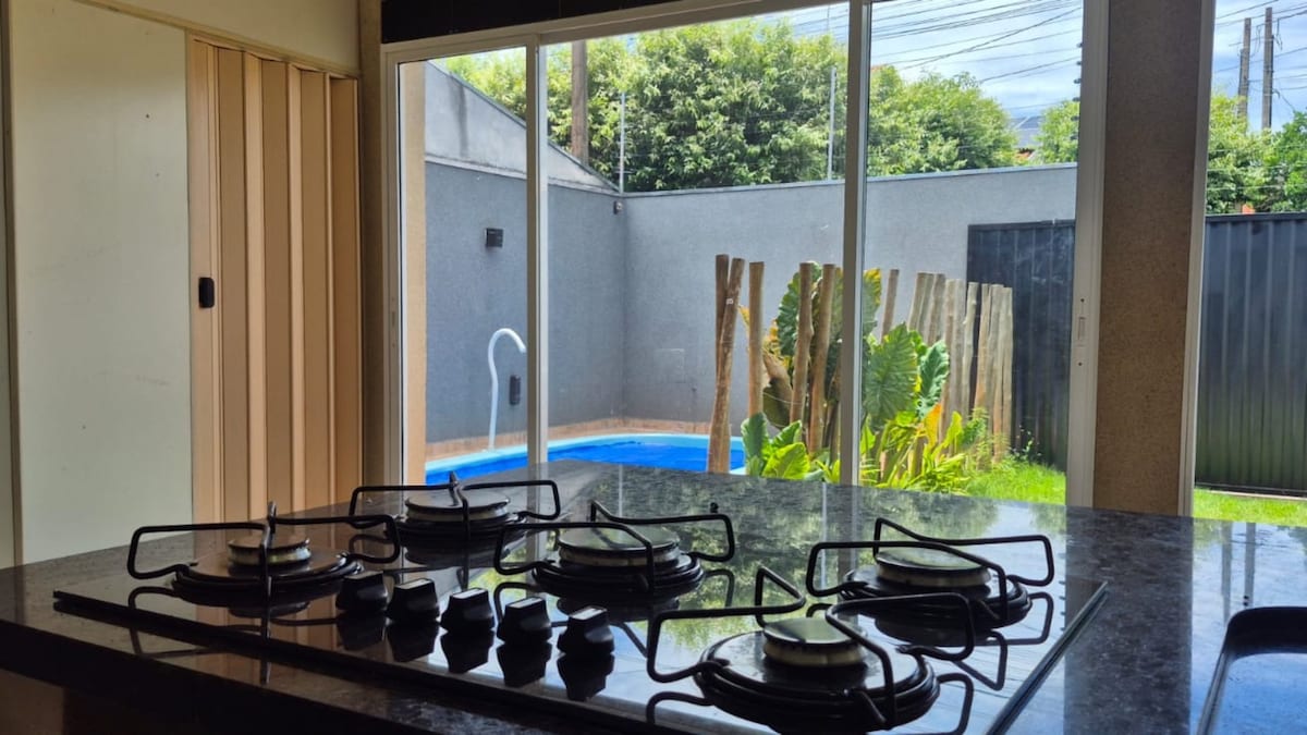 Una casa acogedora y tranquila, barbacoa y piscina con jacuzzi para relajarse durante tu estadía. Se encuentra cerca de Shopping Cidade Norte, un lugar muy tranquilo y organizado. Ya tiene todo lo necesario para cocinar, tomar una ducha y descansar. 1 dormitorio con una cama doble y otro dormitorio con 1 cama doble y 1 cama individual. Tiene aire acondicionado en las habitaciones.