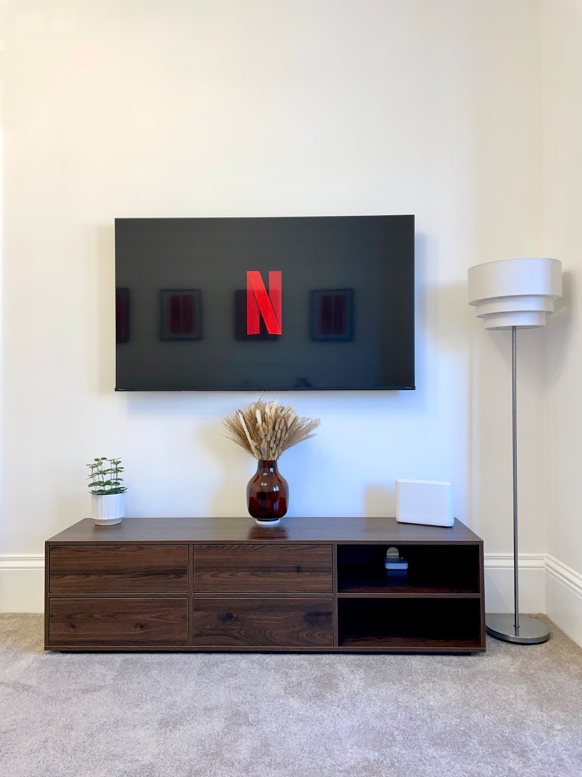 Un poco diferente de lo que normalmente hacemos en Airbnb, antes de la pandemia este era nuestro hogar muy querido. Yo diría que nuestro gusto es ecléctico, nos encanta mezclar muebles antiguos con artículos nuevos e industriales y cosas que Peter ha construido él mismo (incluida una isla de cocina de hormigón) y piezas de inversión clave (como la cama principal Super-king). Somos artistas locales entusiastas, como verás. Este departamento se trata mucho de tiempo juntos, hay un televisor de 55 pulgadas para noches de cine y una colección de juegos de mesa para todos los gustos.