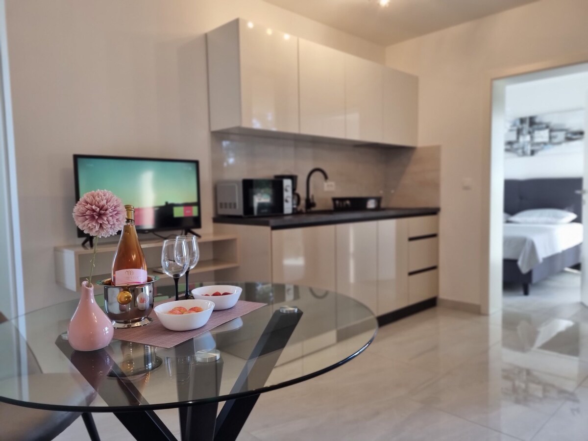 Cerca del mar (a 80 metros de la hermosa playa), en una ubicación maravillosa junto al pinar, se encuentra el apartamento totalmente amueblado Niko. Los apartamentos ofrecen todo lo necesario para unas excelentes vacaciones con total paz y tranquilidad. El apartamento es para dos personas y una más en el sofá del salón. Mobiliario moderno, que consta de un dormitorio con cama doble, sala de estar, comedor, cocina totalmente equipada, terraza con baño y plaza de aparcamiento gratuita. Apartamento con una superficie total de 34 m2.