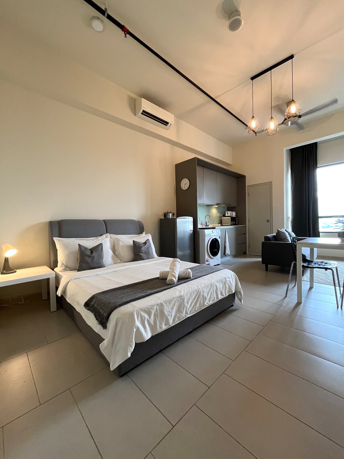 Explora nuestro acogedor estudio, que puede alojar de 2 a 3 personas con una cama tamaño queen y un sofá cama. A solo 15 minutos en coche de KLIA T1/T2, el lugar está rodeado de muchos restaurantes, sucursales de comida rápida, tiendas de comestibles y lavanderías, todo a poca distancia a pie. Disfruta de todas las comodidades, incluido el parque infantil, la zona de barbacoa, el gimnasio y la piscina, con seguridad las 24 horas, 7 días a la semana. * No disponible para dejar el equipaje antes de las horas de llegada. Debido al diseño del edificio, es necesario subir 10 escalones para llegar al ascensor.