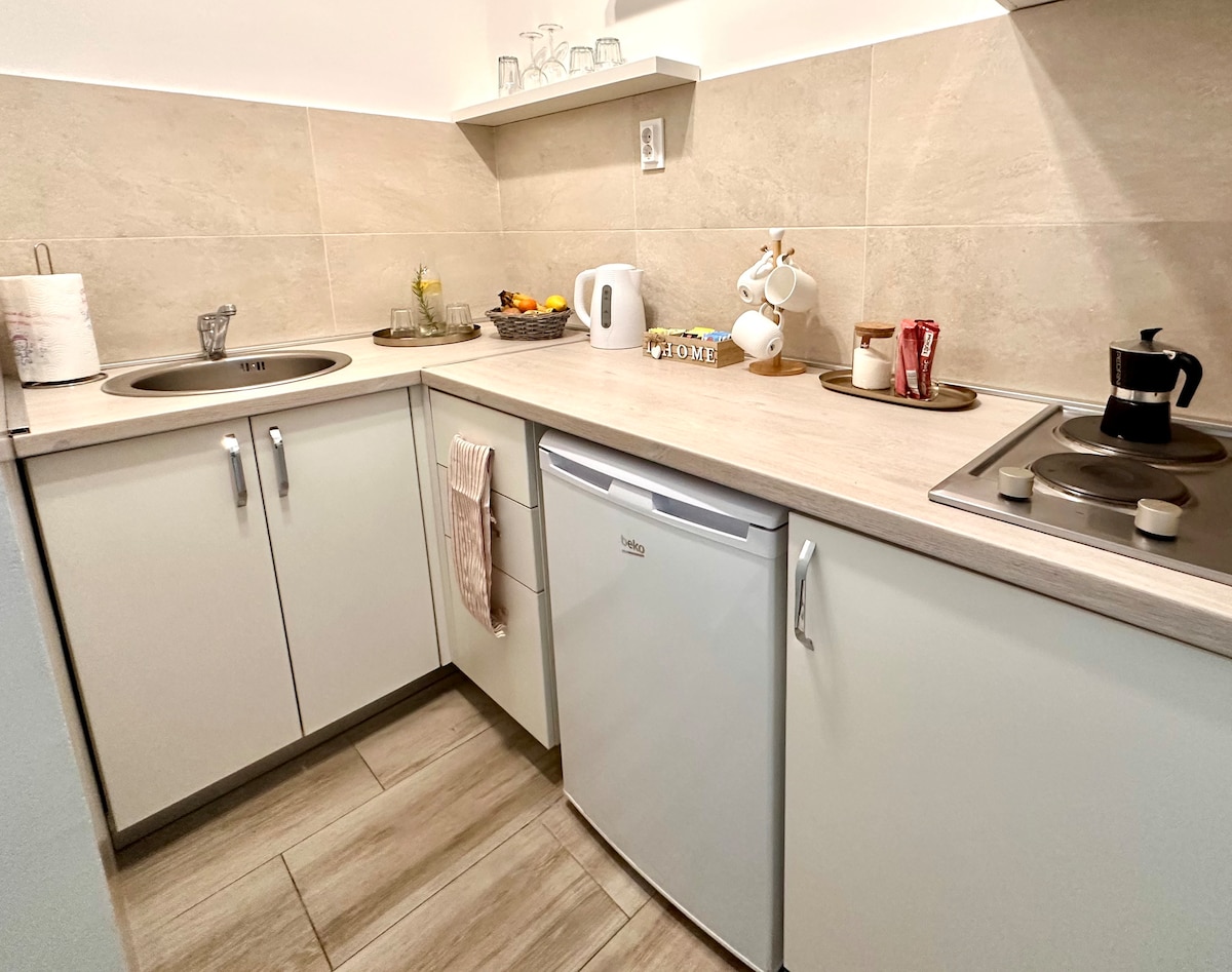 Este apartamento tipo estudio tiene una cama doble y un sofá, cocina totalmente equipada y también hay un armario con perchas. Proporcionamos sábanas en todas las camas. Refréscate en el acogedor baño y con todas las cosas necesarias que proporcionamos. El sofá se puede utilizar como cama extraíble para un adulto o dos niños. En la terraza amueblada podrás disfrutar de tu café por la mañana. Ofrecemos conexión wifi gratuita en todos los apartamentos y TV por cable en la pantalla plana. Ofrecemos estacionamiento gratuito delante del edificio.