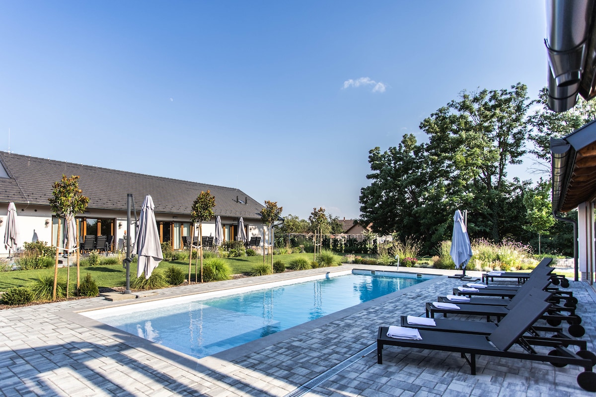Elysium Estate Szekszárd: lujo y serenidad en el corazón de la región vinícola Escápate a Elysium Estate Szekszárd, un refugio privado de lujo donde la elegancia se encuentra con la naturaleza. Disfruta de amplios interiores tipo castillo, un impresionante jardín, piscina privada, jacuzzi y bañera de hidromasaje. Ubicada en la región vinícola premium de Szekszárd, esta exclusiva finca ofrece total privacidad, perfecta para escapadas románticas, retiros familiares o reuniones especiales.