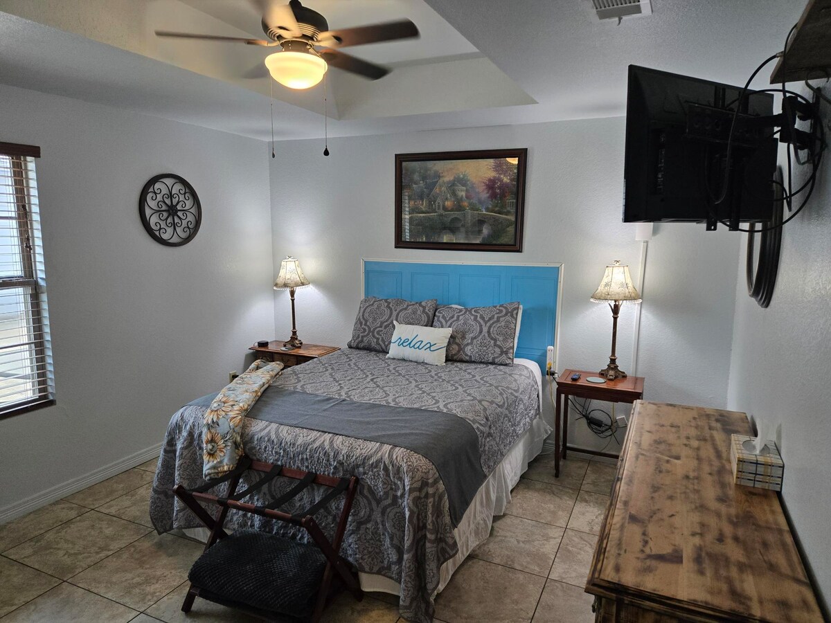 Casi 900 pies cuadrados de cocina MUY limpia, muy privada, completa, baño completo, dormitorio grande, puede dormir hasta 4, 3 televisores, mucho espacio en el armario, cerca de Baylor, Scott y White. Con azulejos en todas partes, todo esterilizado. Entrada privada, mucho estacionamiento para cualquier cosa. Cama tamaño queen, futón de tamaño completo y 2 sofás. 3 espacios separados. La unidad está unida al resto de la casa, pero hay una puerta que la separa y se cierra desde ambos lados. 10 % de descuento en 7 días, 25 % de descuento en 30 días.