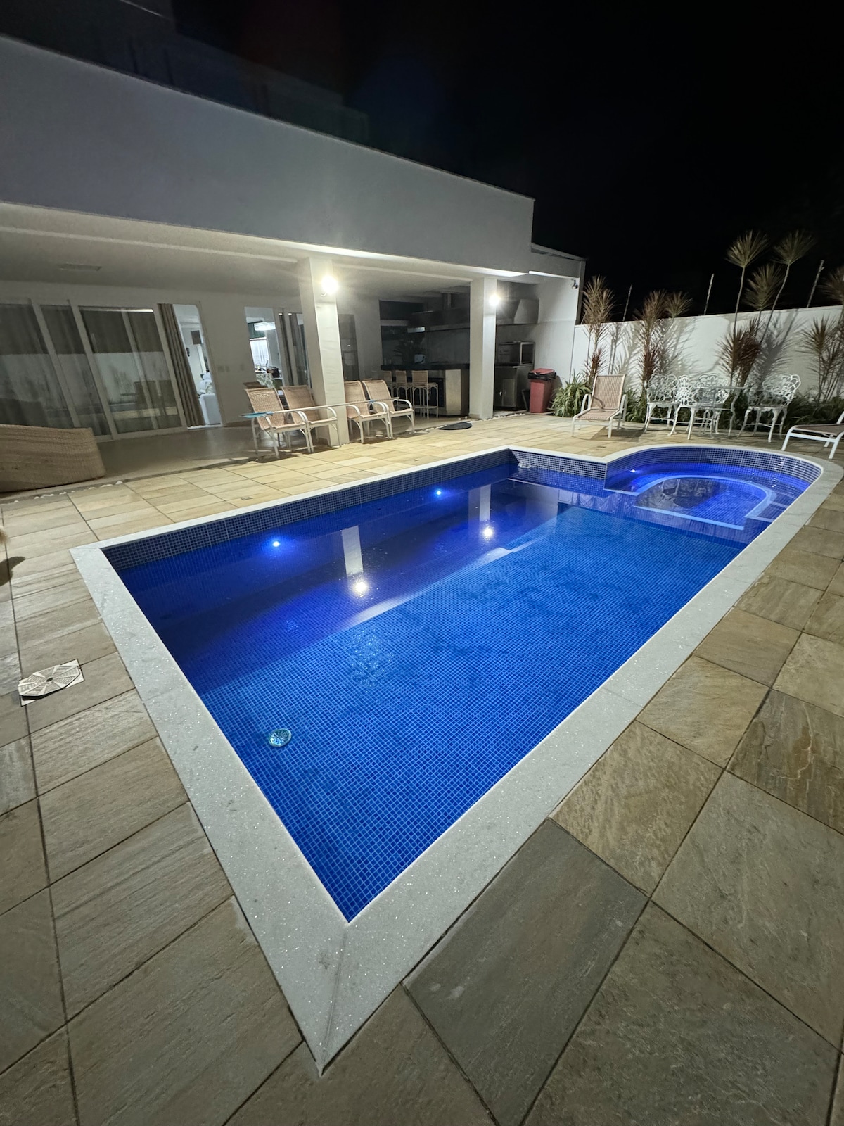 Casa de alto estándar, cómoda y acogedora. A 300 metros de la playa, 3 suites, 2 dormitorios con 2 literas cada uno y 2 baños separados. Aire acondicionado en las habitaciones. Hermosa piscina, espacio gourmet con parrilla, campo de fútbol con césped, sala de juegos con mesa de billar (exclusiva para mayores de 18 años). Cocina bien equipada en utensilios y electrodomésticos. Wifi de fibra. La casa tiene cuidadores que viven en el anexo del garaje y se pueden contratar directamente, si hay interés.