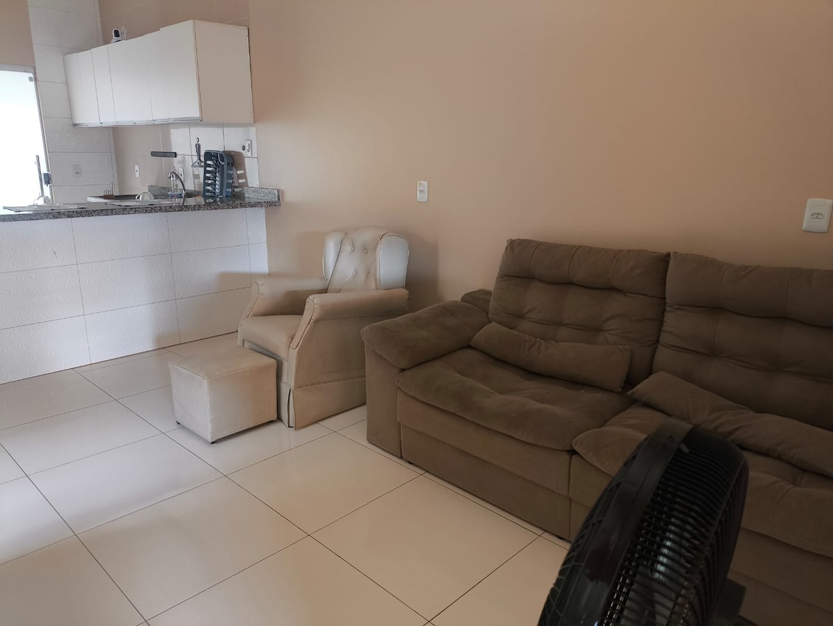 Casa ubicada : A 2 km del Hot Club de Águas. A 5,5 km del centro de la ciudad A 2,5 km de la cascada de la planta 450 m de Supermercado Cuenta con un garaje para dos autos, 1 suite con una cama doble y aire acondicionado, 1 dormitorio con una cama doble y ventilador, 1 baño social, una sala de estar con TV, una cocina y un área al aire libre con una lavadora. Tiene 1 colchón individual adicional, wifi y ropa de cama.