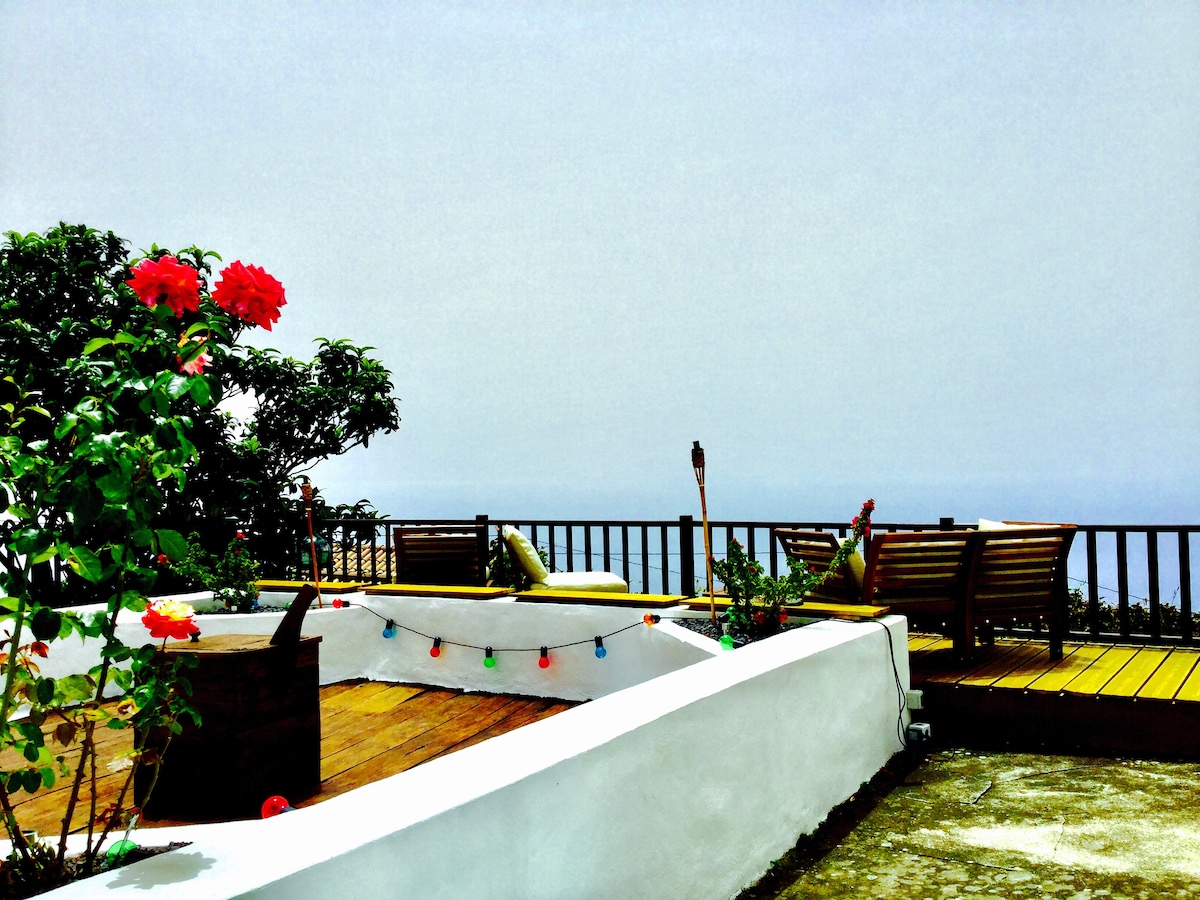 Casa de vacaciones independiente en la finca de 7,5 ha Hacienda La Palma. Tranquilidad y aislamiento absolutos con un microclima único. En medio del viñedo, La Placita ofrece un acogedor refugio para 2 personas. Disfrute de sus mejores días con unas vistas increíbles del interminable océano Atlántico y un cielo con fantásticas formaciones nubosas, que se convierte en un claro cielo estrellado tras una resplandeciente puesta de sol roja por la noche.