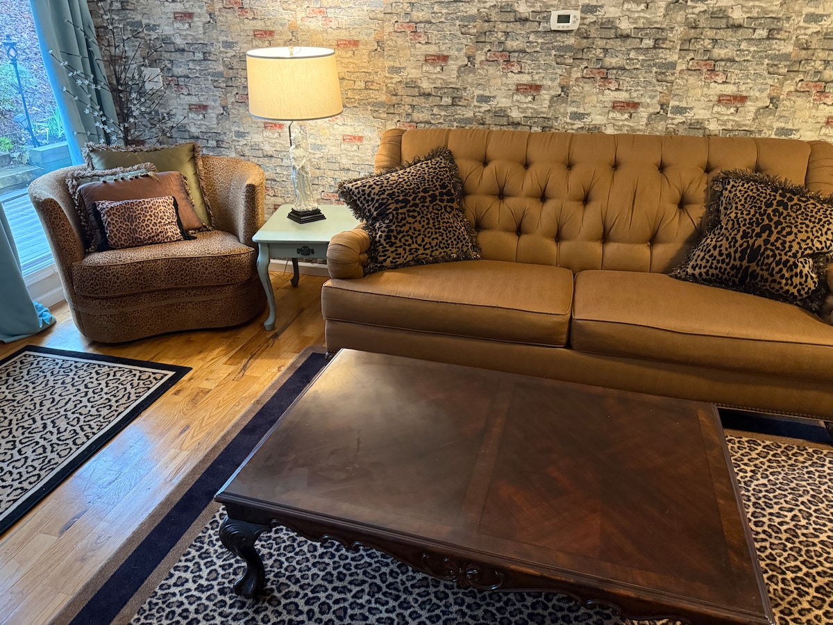 Kick back and relax in this calm, stylish space. This apartment has its own entrance , stairs to the side of the home . Guests have access to patio table and outdoor space outside of their door. Hardwood floors in both bedrooms. One bedroom has a queen bed and furnishings. Second bedroom has a loveseat and cabinet for clothing , open closet . Can be used for office space . Kitchen updated with all appliances and clawfoot tub and shower . Large living space and kitchen table . Wide seat sofa.