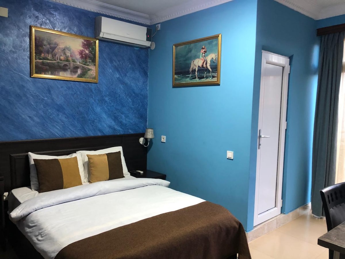 Welcome to Blue Escape – a calm, hotel-style room with balcony and access to a newly built shared drop pool surrounded by nature. Designed in soft blue tones, it’s perfect for solo travelers or couples seeking peace and comfort. Enjoy the fresh air, relax in a cozy bed, and stay connected with Wi-Fi and smart TV. While there’s no kitchen, great cafés are nearby. A quiet retreat just minutes from Batumi’s center.