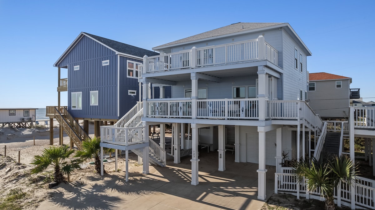 ¡Nueva construcción frente a la playa! Verdaderamente único:🦄 UBICACIÓN y LUJO en la PLAYA, ¡y a solo unos pasos del mejor restaurante de Surfside (SEAHORSE)! Disfruta de hamacas y juegos debajo de la casa. Parrilla de carbón. ¡Sube las escaleras hasta una impresionante terraza a la sombra con vistas desde el paso de San Luis hasta el muelle! ¡Vistas despejadas de más de 180 grados! Habitaciones con acceso a la terraza y a la zona de observación de estrellas con fogata 🔥. YouTube: Beachfront Luxe para ver videos. En el precio total indicado, se mostrarán $125 por la tarifa de limpieza y $75 por 2 mascotas.