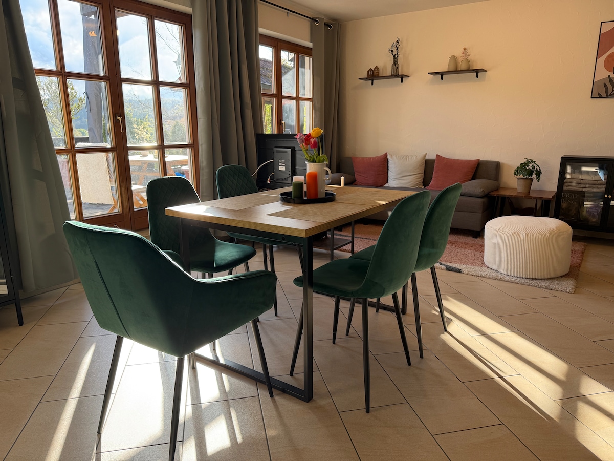 Disfruta de un descanso relajante con toda la familia en este apartamento tranquilo y elegantemente amueblado con impresionantes vistas al campo. El espacioso apartamento de 4 habitaciones ofrece todo lo que tu corazón desea: Una cocina moderna totalmente equipada te invita a cocinar juntos. Dos balcones soleados y amueblados ofrecen refugios ideales para relajarte y descansar. Televisores inteligentes con Netflix están disponibles para el entretenimiento en la sala de estar, así como en el primer dormitorio. Inodoro aparte.