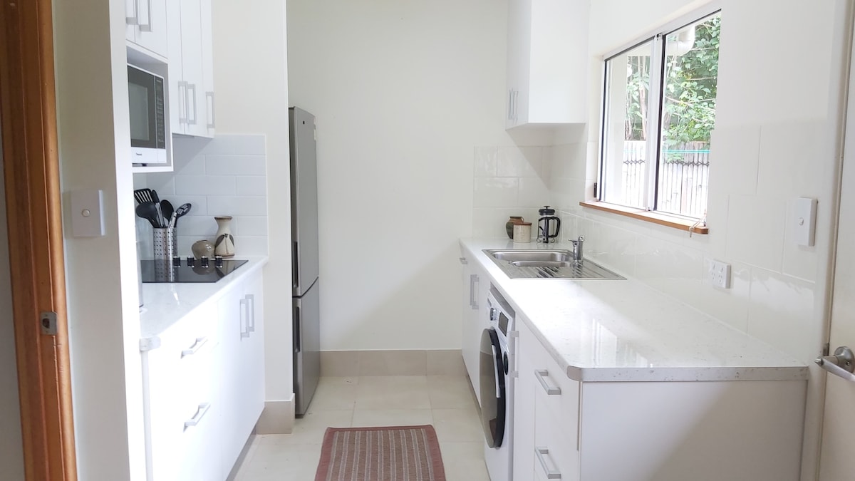 A 15 minutos en auto de la ciudad. ¡Precioso refugio en la selva tropical! Entrada privada, independiente, cocina, dormitorio grande + baño privado, patio, sillas de mesa, aire acondicionado. Fregadero, microondas, cubiertos, vajilla, utensilios de cocina, té, café, leche, tostadora, cocina portátil, freidora de aire, barbacoa. TV+Netflix. Adjunto a la pared frontal gruesa de la casa que también tiene una puerta cerrada sin usar como parte de la pared. Todavía muy privado. ¡Lil y Rob viven aquí +Ziggi, nuestro pequeño perro humanoide limpio sin maltrato! Compartir patio de piscina de lavandería. Agua del grifo ideal para beber