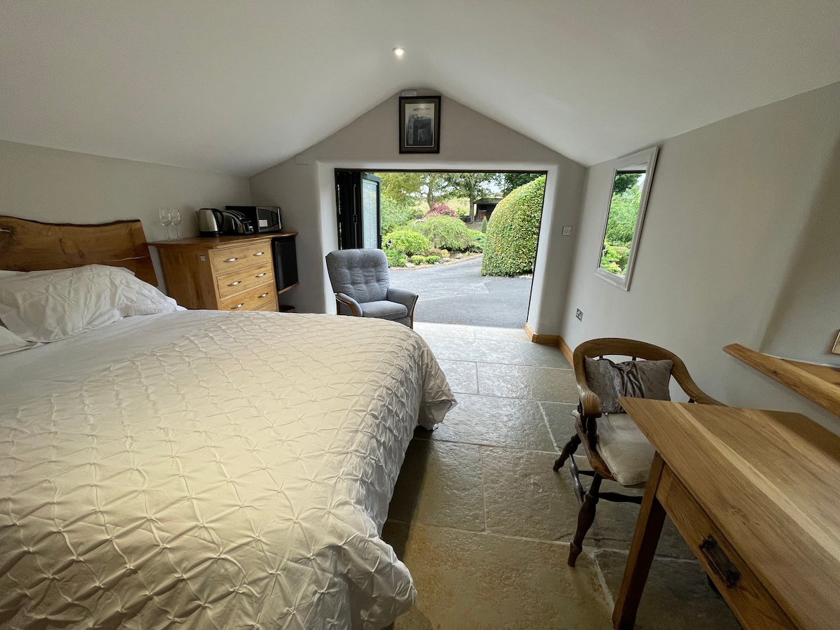 Suite independiente luminosa, moderna y lujosa en la planta baja de la casa de los anfitriones. El alojamiento es de planta abierta con un gran baño con ducha y zona de cocina equipada con nevera, microondas, hervidor de agua y tostadora. El Bolthole tiene su propia entrada privada en la parte trasera de la propiedad, desde el patio y con vistas al bonito jardín de la casa de campo. La suite está a 5-10 minutos a pie del centro de la ciudad y a solo cinco minutos a pie cuesta arriba de Ilkley Moor.