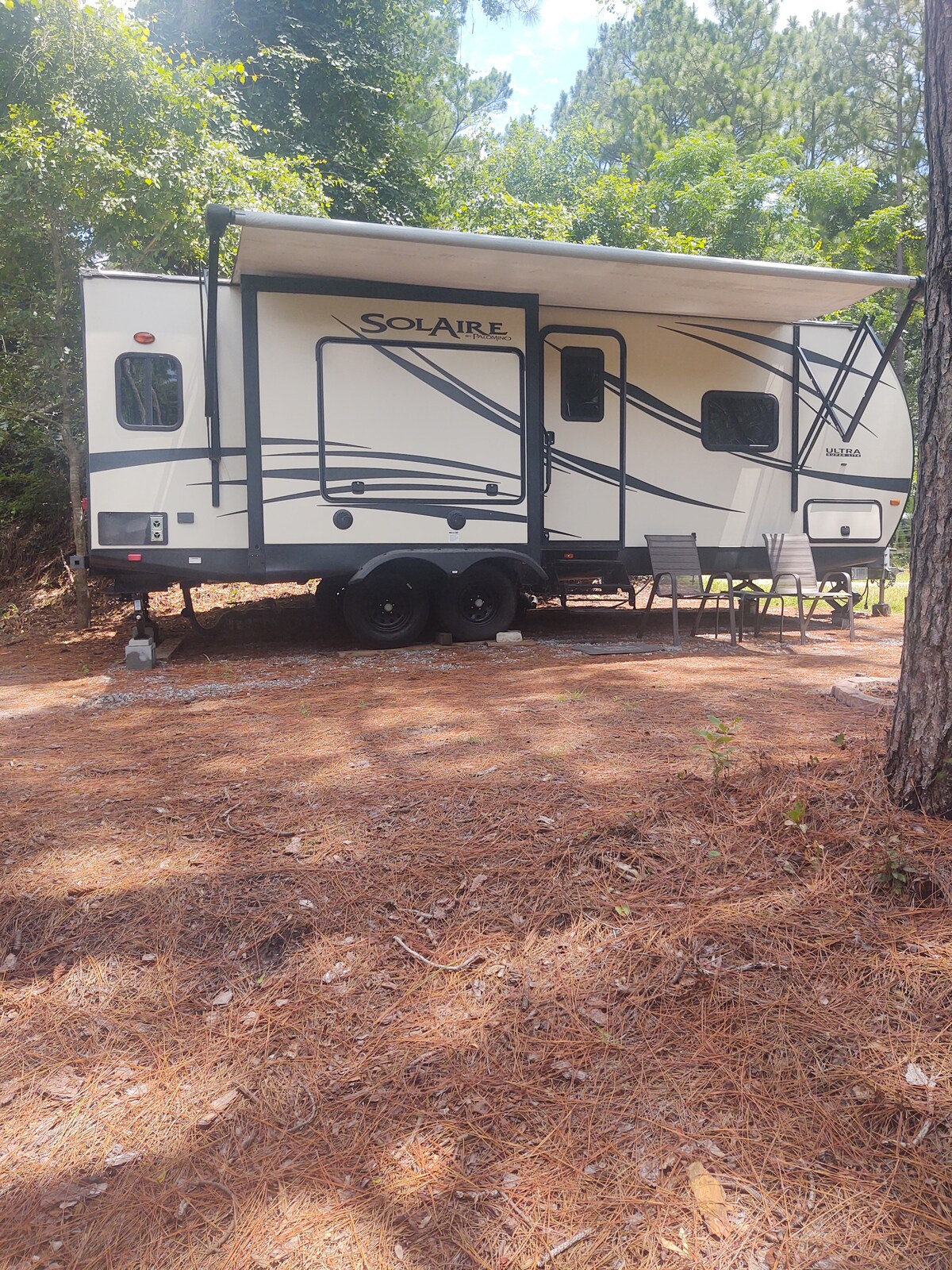 Tranquilo y privado. El RV es una casa rodante de 2017 de 38 pies. Está estacionado junto a un estanque de 1/2 acre con peces, patos, águilas pescadoras, garzas, muchos otros animales salvajes. Tienes tu propio porche sobre el estanque. Hay senderos para caminar. Está ubicado a unas 3 millas del centro de Bluffton y a unas 5 millas de Hilton Head Is. Refrigerador de tamaño completo y cocina completa. También hay cabras, cerdos, gansos, pollos y escualos.