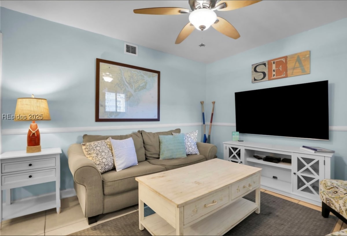 Despiértate con vistas panorámicas al mar y a las marismas en este departamento de 2 habitaciones y 2 baños, magníficamente renovado, en Hilton Head Island. Último piso = tranquilo, sin vecinos arriba. Ubicado en un complejo turístico cerrado frente a la playa con acceso privado al paseo marítimo, ¡sin calles que cruzar! ✨ Perfecto para: familias, parejas, viajes de chicas, escapadas de golf 🌅 Balcón privado con vistas espectaculares al amanecer 🏖️ A pie o en autobús a la playa (por un paseo marítimo privado de 400 yardas) 🔑 Entrada fácil sin llave | Ascensor cerca