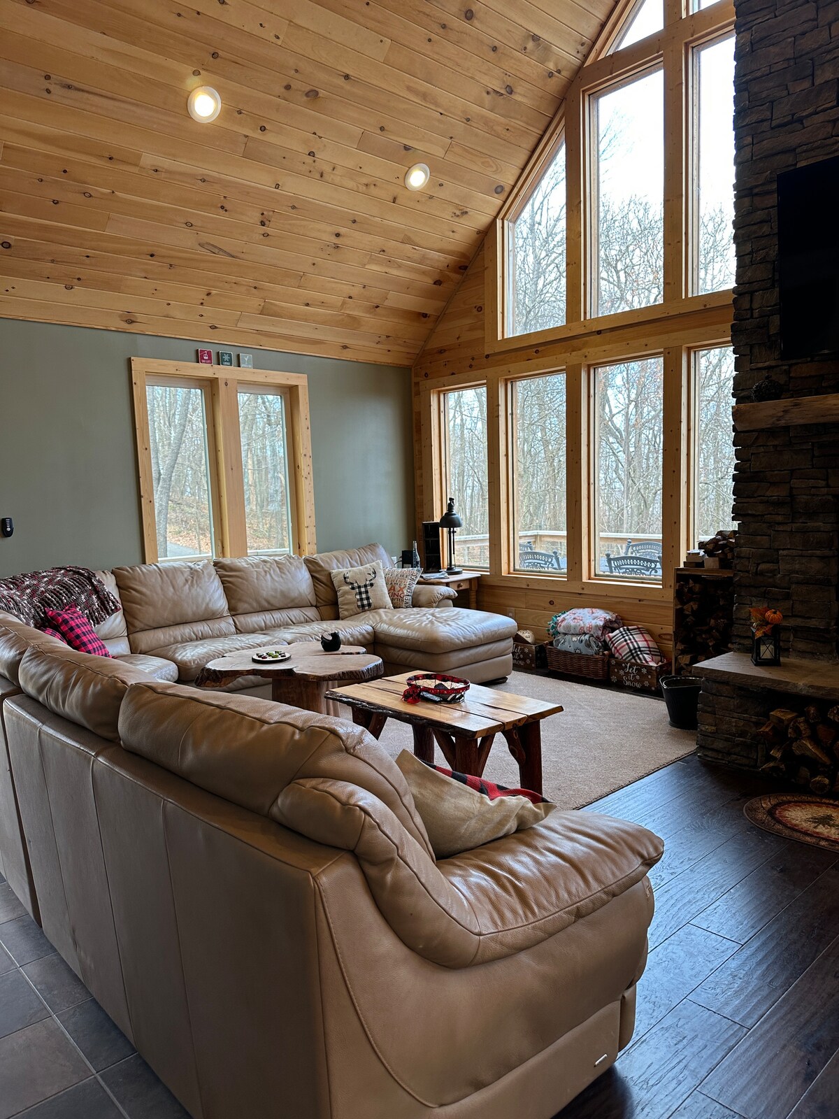 Moderna cabaña de 4 dormitorios y 4 baños a menos de una milla del lanzamiento de barcos Shy Beaver en Raystown Lake. Rodeada de bosques tranquilos, esta casa privada ofrece un diseño abierto y contemporáneo con espacio para familiares y amigos. Disfruta de una terraza elevada con parrilla de gas, una relajante bañera de hidromasaje y una acogedora chimenea. Perfecto para días de lago, senderismo o relajarse en la naturaleza: tu refugio ideal para la relajación y la aventura.