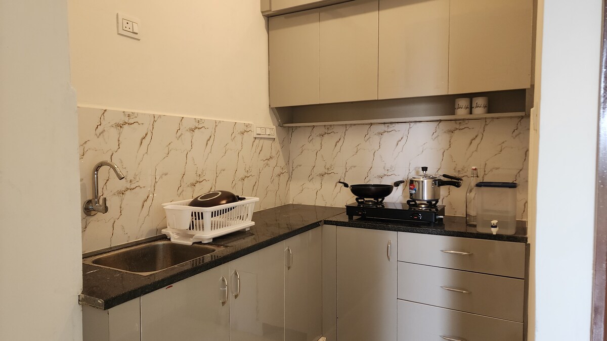 Aura es un moderno 1BHK a estrenar ubicado en un edificio tranquilo y seguro en Akshayanagar Circle. El alojamiento incluye una acogedora sala de estar con un televisor Google de 43 pulgadas, una cocina totalmente equipada, un inversor de energía de respaldo, una lavadora y un dormitorio tranquilo con una cama tamaño queen. Diseñado para dos, familias, huéspedes solos y parejas, Aura ofrece todo lo que necesitas para la comodidad y conveniencia. Supermercados, cafeterías, transporte, comida callejera y productos básicos están a pocos pasos.