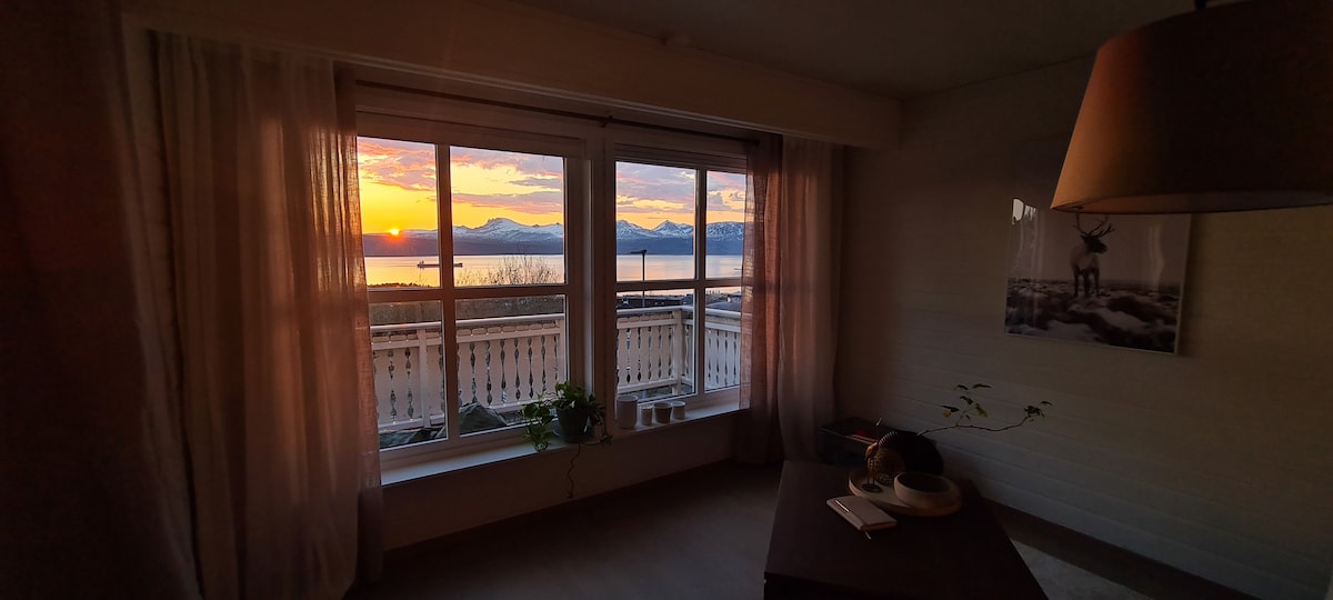 Apartamento tipo estudio con entrada independiente. Ventanas frente a un jardín y el sol de medianoche/ mar / aurora boreal. Mesa de jardín, sillas de jardín. Cama doble de 150 cm Wifi de alta velocidad, televisión por cable. Cocina pequeña, dos platos fogones. Té y café y DESAYUNO incluidos. Microondas, nevera/congelador equipamiento necesario. Cena para dos personas. Baño con ventana. Lavadora + secadora. Ubicado en el centro de Narvik, en una zona tranquila de la ciudad. A 9 minutos a pie del centro de la ciudad, Estación de tren y autobús de vuelo. A 3 minutos a pie de una pequeña playa.