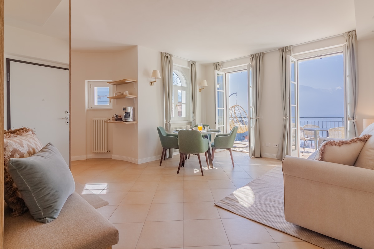 El apartamento, con sus enormes ventanales, se encuentra en una posición muy especial, directamente sobre el agua: rodeado por una hermosa terraza, tienes el privilegio de estar a solo 5 minutos a pie del centro a lo largo del paseo marítimo del lago y aislado al mismo tiempo. Una terraza de 120 metros cuadrados te permite disfrutar de un paisaje compuesto solo por agua, cielo y montañas. Tan cerca del agua que incluso se puede pescar directamente desde ella, y algunos de los más valientes incluso se sumergieron en el lago (a unos 6 metros bajo tus pies).