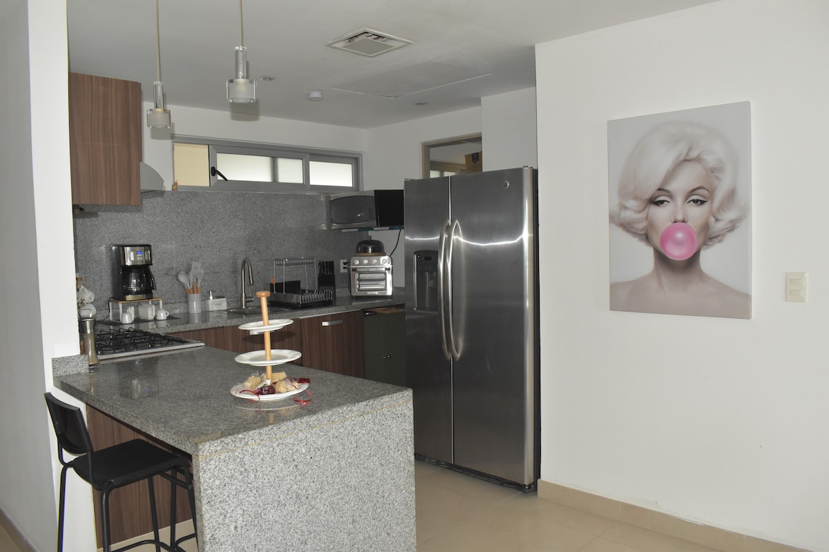Céntrica casa en residencial privada y de arquitectura moderna. El área es grande y espaciosa, con vistas llenas de árboles y jardines; Con amplios espacios y otros muebles como la silla mecedora de la sala en lo que disfrutas la televisión, trabajas en la computadora o lees un libro. La cama es suave y cómoda con un tamaño ideal para descansar, el baño amplio, la cocina equipada y el cuarto de lavado te hará sentir como en casa. ¡No olvides preguntar por el parque y los juegos de mesa!