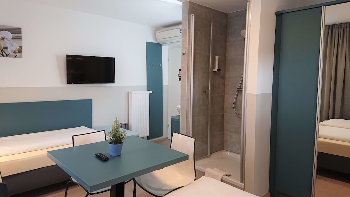 Habitación individual funcional con pequeña sala de estar y balcón para 1 persona, aprox. 16 m² Equipamiento: * Cama individual: 200 x 90 cm * Zona de ducha y lavabo integrada en la habitación, secador de pelo, gel de ducha, jabón * WC separado * TV de pantalla plana de 26 pulgadas, W-LAN, radio reloj * Mininevera, hervidor de agua, vajilla * Balcón