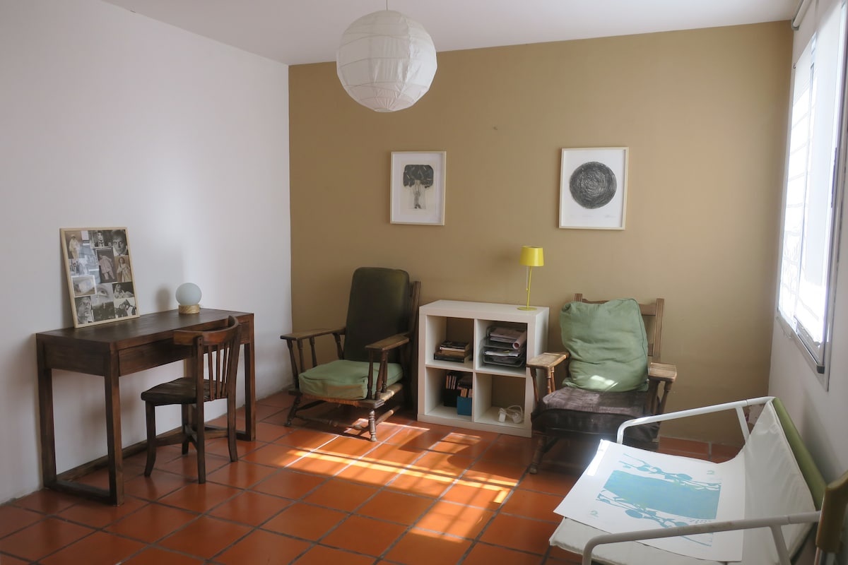Relajate en este alojamiento único y tranquilo. El bienestar de poder disfrutar de la galería y el jardín. Cama Queen y otra cama de una plaza para un tercer huesped. Cochera cubierta gratuita en la propiedad (autos de hasta 4,25 m de longitud). Espacio de trabajo.