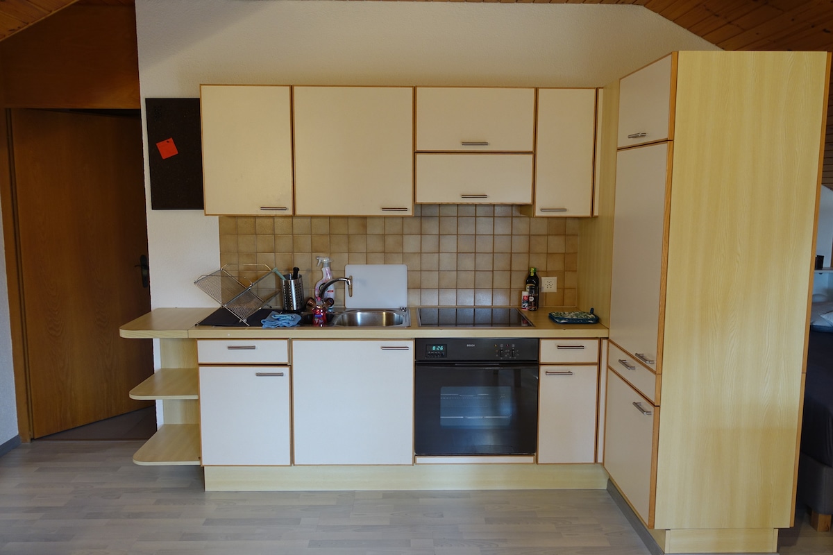 ¡Nuestro acogedor departamento penthouse con 100 m de espacio habitable y 140 m de terraza en la azotea en el campo es inspirador! - 1 dormitorio principal con cama doble - 1 enorme cocina moderna… Mesa de comedor, sofá y lavadora y secadora - 1 espacio de estacionamiento gratuito - 10 minutos a Dornbirn (feria comercial), Bregenz y Suiza La vista de las montañas austriaca y suiza se puede disfrutar en la terraza de la azotea recientemente renovada