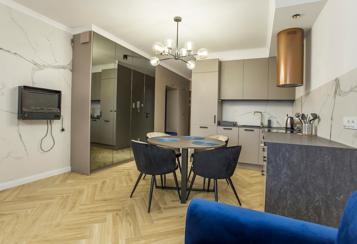 Modernas y elegantes, estas palabras describen mejor lo que un grupo de diseñadores logró al preparar este apartamento. El apartamento está ubicado en el séptimo piso. La terraza tiene una hermosa vista del horizonte de la ciudad. Por las noches, literalmente te deja sin aliento. Los huéspedes podrán acceder al apartamento completo. En el departamento hay todo lo necesario, empezando por la lavadora y lavavajillas, terminando con secadora de pelo. El apartamento cuenta con una plaza de estacionamiento dedicada. Te invitamos...