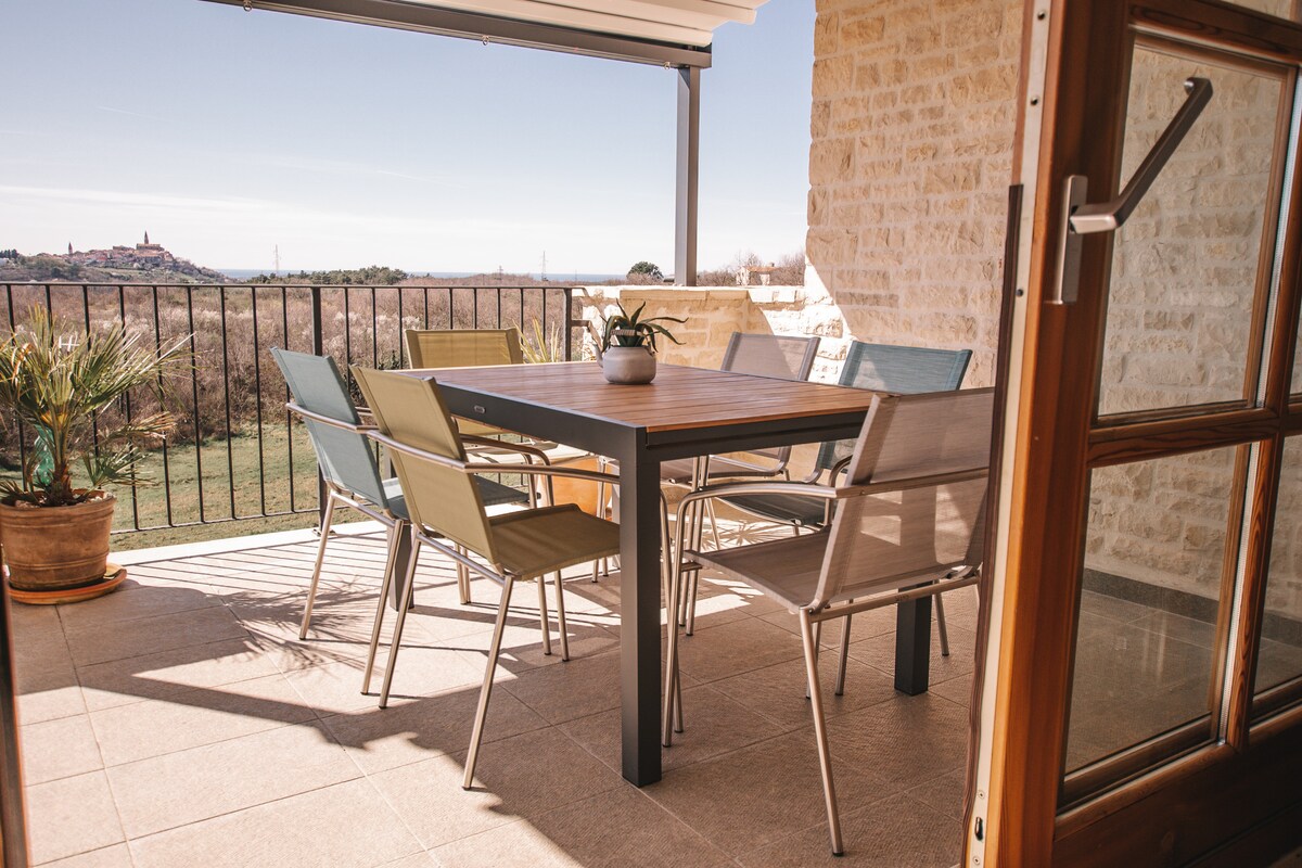 Esta hermosa casa adosada «Casa Irmi» en Bibali está situada en una colina con una vista fabulosa del casco antiguo de Buje y del mar Mediterráneo. Disfruta del agradable jardín común con una gran piscina y cena en nuestra terraza con vistas a una grandiosa puesta de sol. Prueba la excelente comida de Istria en una de las acogedoras konobas de los alrededores. Bibali se encuentra a 2 km del centro de Buje, en una posición tranquila y soleada en una ladera, a 12 km del mar.