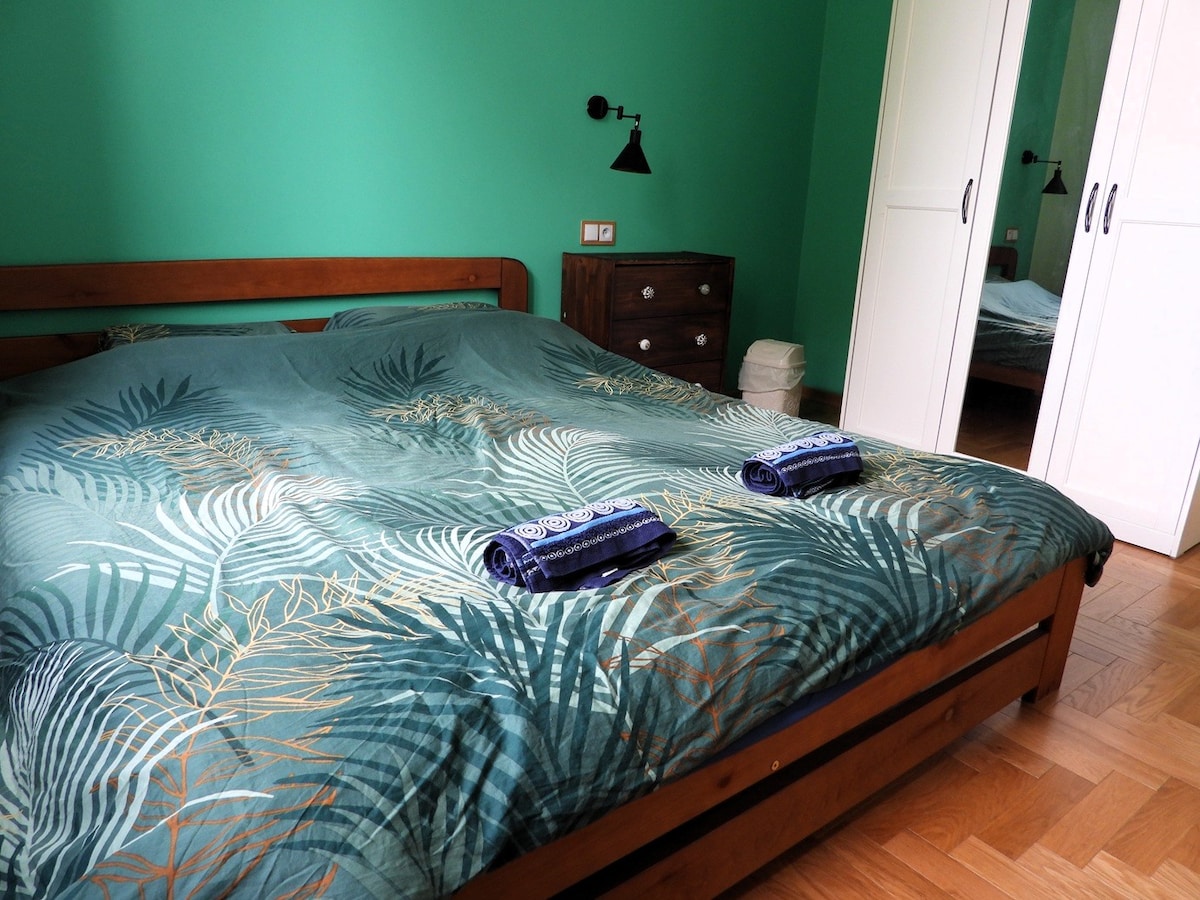 A spacious 45 sq.m. apartment in the prestigious Mickiewicza estate, with a large balcony. We provide a parking space in the underground garage! There is a bedroom with a 160x200 bed and a large wardrobe, a living room with a sofa that folds out into a double bed with a mattress, a dining room, a TV, a bathroom and a fully equipped kitchen. The apartment is great for a stay of up to 4 people. Close to numerous parks, Żoliborz, Vistula River. Ideal for business travelers and families.
