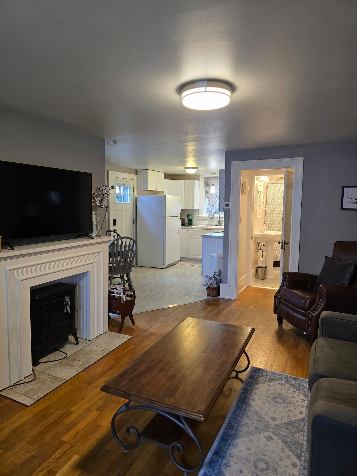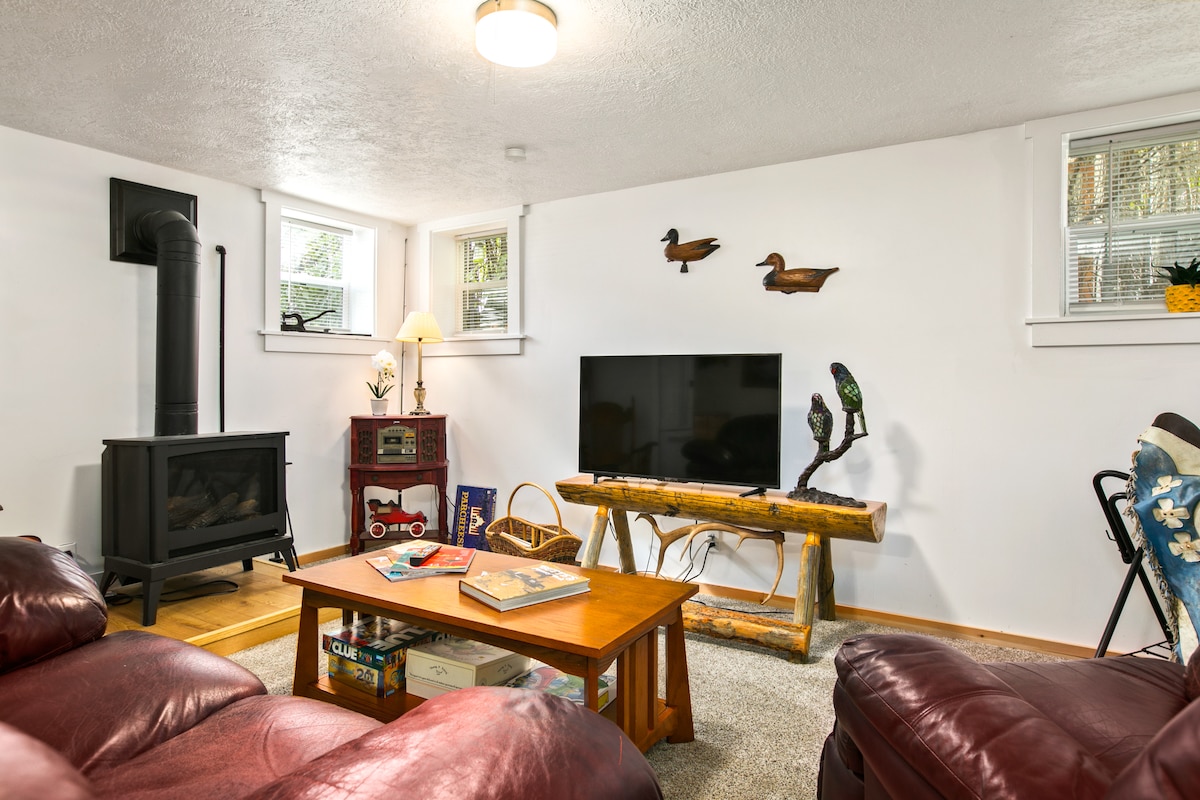 Amplio apartamento de dos dormitorios y 1 baño en el sótano con cocina completa (estufa, nevera/congelador, microondas, tostadora, utensilios, cubiertos, etc. La sala de estar tiene una bonita chimenea de gas independiente, lo que hace que el apartamento sea muy acogedor. También hay un televisor con Amazon Firestick, que permite a los huéspedes acceder a Netflix, Hulu, YouTube, etc. Cada dormitorio tiene una cómoda cama tamaño queen, tocador y chimenea eléctrica para mayor comodidad y ambiente.
