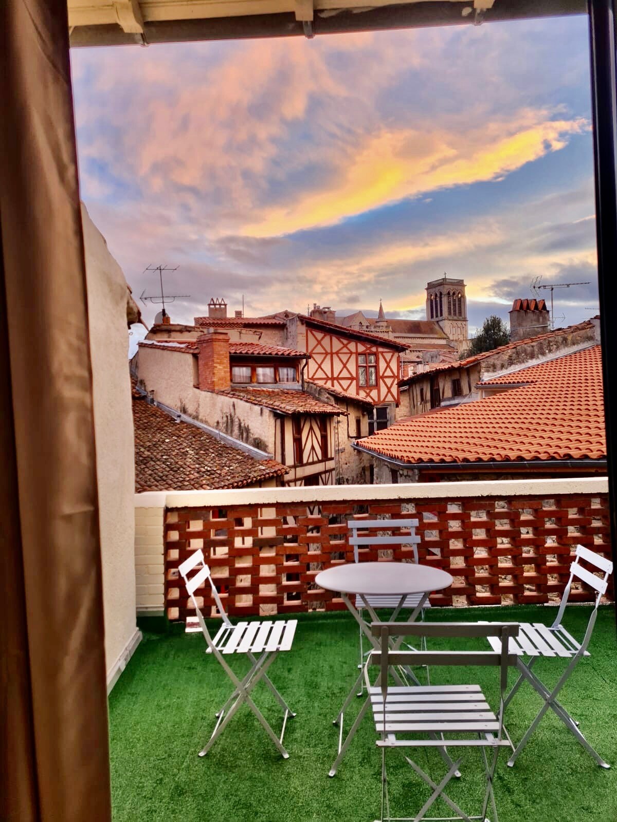 Si su coraje le permite subir los 42 escalones de una escalera poco gloriosa, tendrá la oportunidad de encontrar un pequeño nido acogedor situado bajo los tejados. A continuación, podrá descubrir esta vista impresionante del barrio medieval y su iglesia de San Cerneuf y, después de ignorar las antenas de televisión en los tejados y el ruido de la moto que pasa a lo lejos, su imaginación podría perderse en otra época.