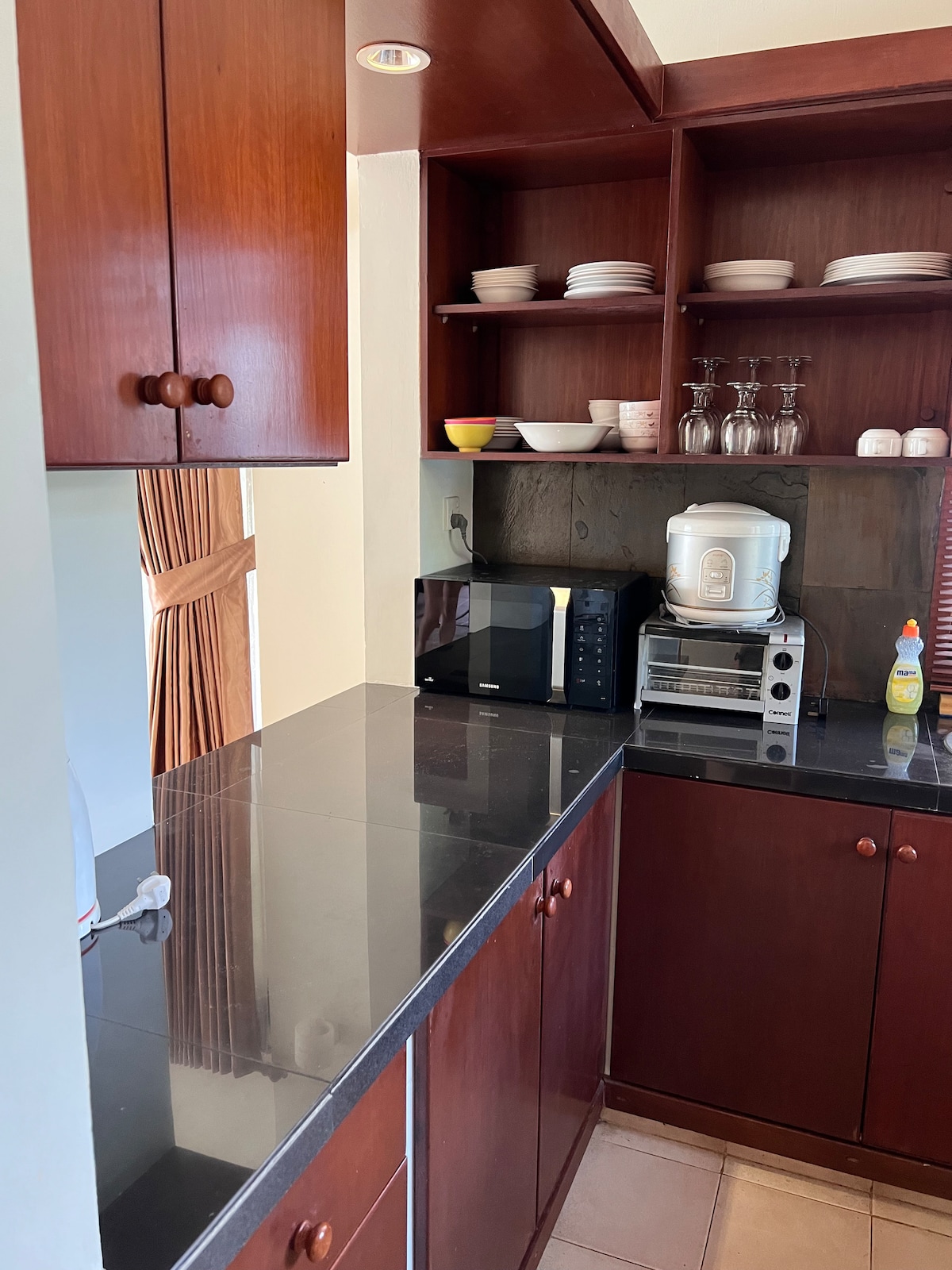 Esta agradable casa cuenta con 2 dormitorios de buen tamaño, 1 sofá cama, 1 baño completo con calentador de agua, una sala de estar con aire acondicionado y TV conectada a Internet, una cocina de buen tamaño equipada con utensilios de cocina y comedor para 5 personas. Cada habitación consta de aire acondicionado, armario, con 1 cama tamaño queen y 2 camas individuales. También viene con un patio trasero y un patio delantero con estanque de pescado. Ubicado cerca del Centro de Comida, el Área Comercial, la Clínica las 24 horas y el aeropuerto. También hay lavadora, nevera y caja de seguridad.