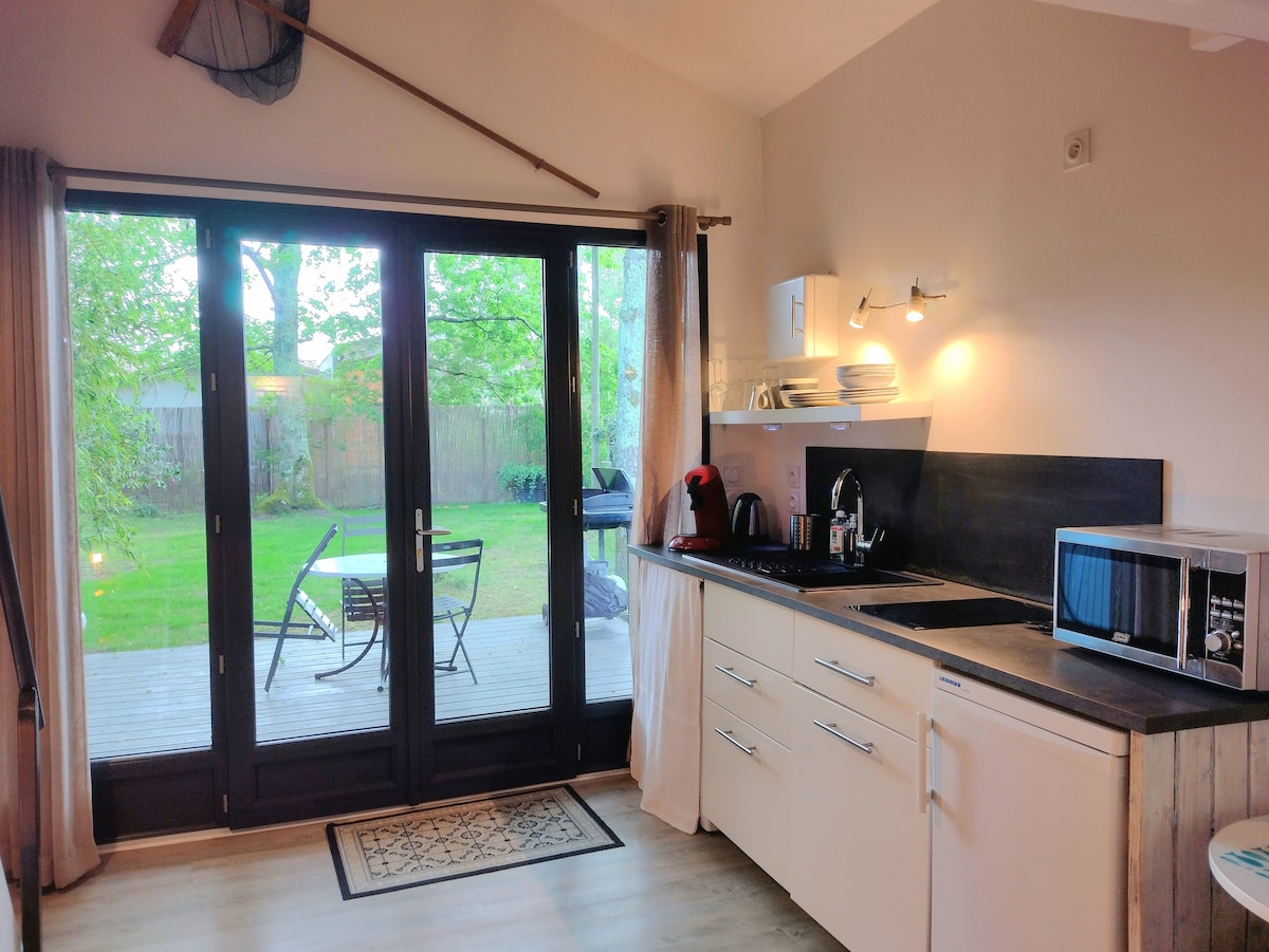En el corazón de la cuenca de Arcachon, chalet de 49 m² con terraza cubierta, situado en la propiedad de una villa. A 1 km de todos los comercios, carriles bici, parques de ocio, a 10 km de Arcachon, a 12 km de la Duna de Pilat y playas oceánicas. Cocina equipada, baño, inodoro, ducha, toallas, lavadora. 2 dormitorios camas 160x200 con sábanas. Pequeño jardín privado, reposeras, plancha, estacionamiento privado cerrado con video JACUZZI CERRADO DE NOV A ABRIL, con un suplemento de 20€ la sesión y solo con reserva