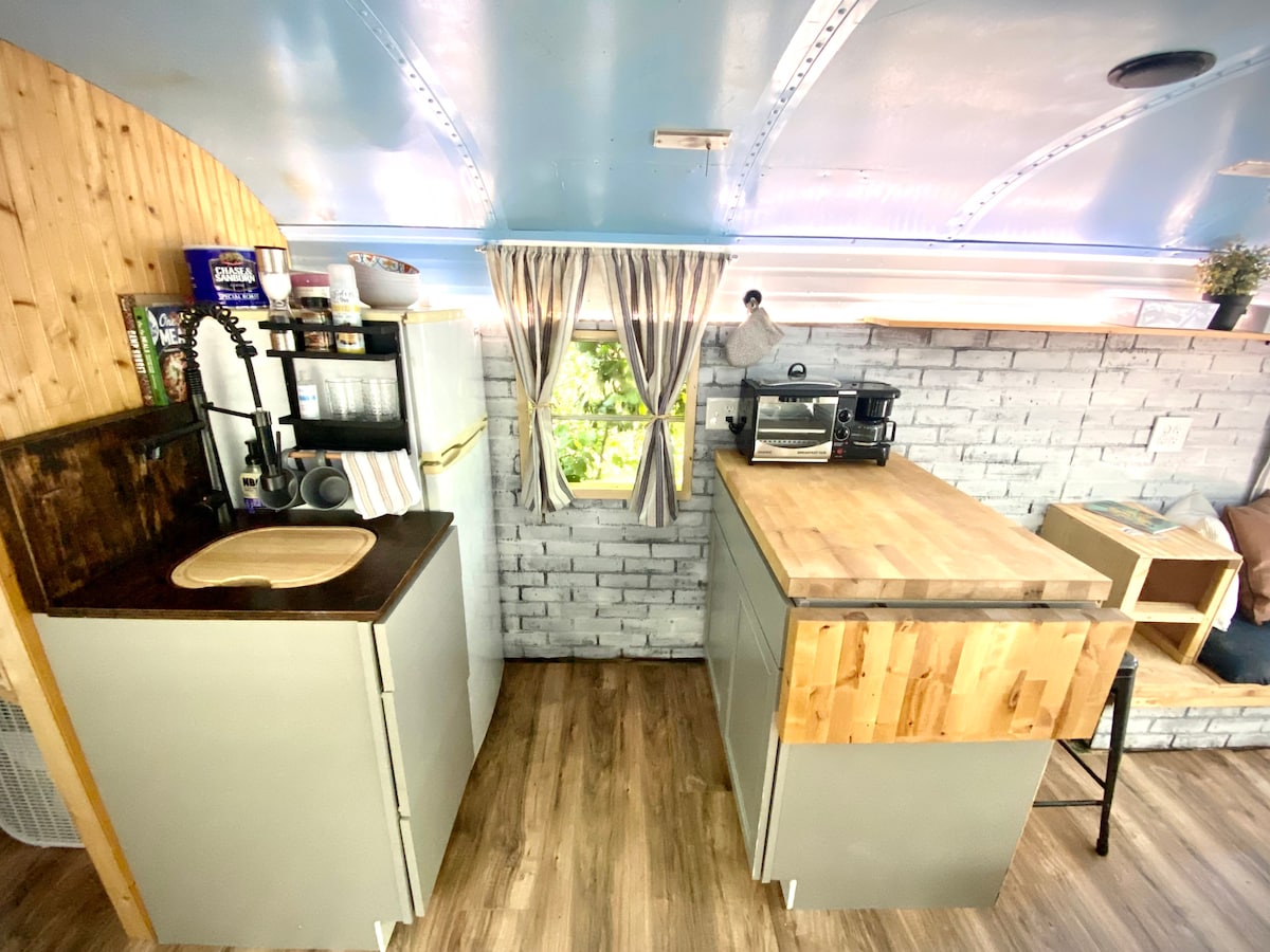 Ubicada en las montañas de Carolina del Norte, nuestra minicasa de autobús escolar reconvertida ofrece un refugio único en el bosque. El vibrante autobús amarillo cuenta con un interior acogedor con una cocina compacta y comedor con ventanas que muestran vistas al bosque. Una cómoda sala de estar incluye un sofá y el área para dormir tiene una cama acogedora. Un baño compacto con inodoro y ducha agrega comodidad. Envuelto por la vida silvestre y a solo 10 minutos del encantador West Jefferson, esta pequeña casa de “Schoolie” es una escapada perfecta a la naturaleza.