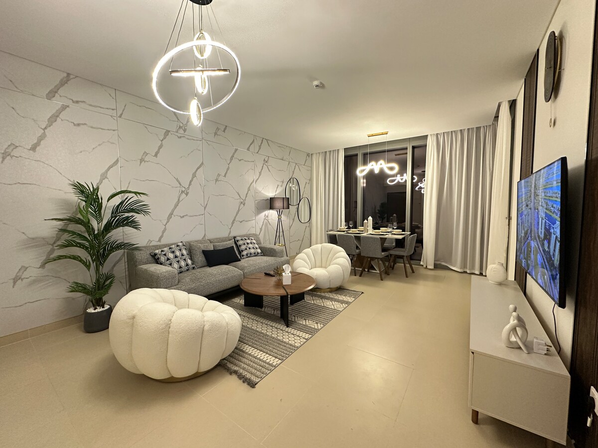 Disfruta del lujo en nuestro elegante apartamento de 2 dormitorios, con impresionantes vistas al Ojo de Dubái desde el balcón. Perfectamente situado, podrás disfrutar de un tranquilo paseo hasta Blue Waters y explorar la vibrante vida nocturna, las atracciones culturales y los restaurantes de alta cocina a solo unos pasos. El apartamento cuenta con amplias salas de estar, servicios modernos, wifi de alta velocidad y una cocina totalmente equipada. Ya sea para viajes en familia o escapadas en grupo, este refugio urbano promete una estancia inolvidable. ¡Reserva ahora!