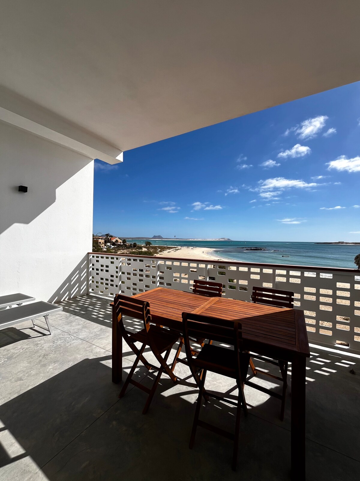 En el segundo piso de la bien cuidada y vigilada casa Costa do Sol se encuentra el apartamento tranquilo modernamente amueblado con vistas al mar, a 400 metros de la playa Sal Rei. Dos dormitorios, sala de estar con balcón envolvente con vistas al Atlántico. En las inmediaciones hay muy buena gastronomía, la extensa playa "Praia Estoril" con encantadores bares de playa y muchas instalaciones para deportes acuáticos.