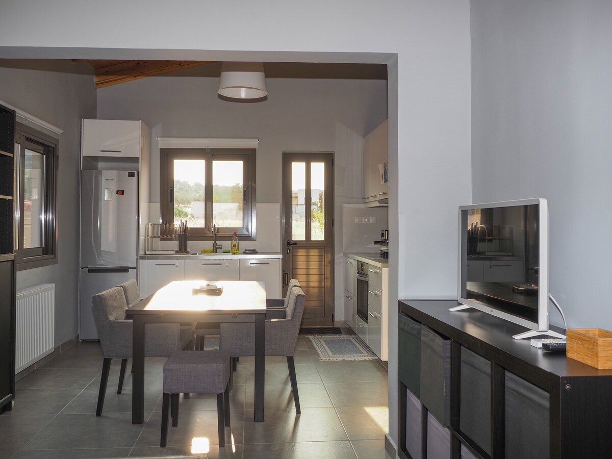 Una casa de 70 metros cuadrados con un dormitorio, sala de estar con chimenea, cocina y aseo con ducha. Se encuentra en una casa rural de 4300 metros cuadrados llena de olivos. Es adecuada para una pareja y 3 niños o 3 personas y 1 niño, o 4 adultos. Es un lugar relajante. En el pueblo y los lugares de los alrededores, cualquiera puede ir en bicicleta y disfrutar de un paseo. Puedes llegar al monasterio de Agios Nektarios caminando en unos 30 minutos.