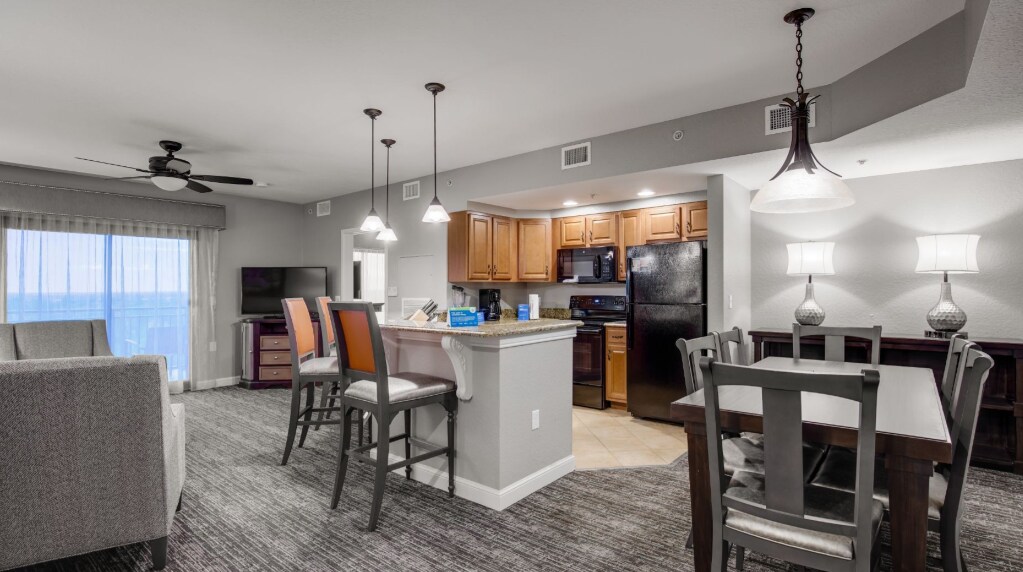 Después de un día mágico en los parques temáticos, podrás relajarte en esta hermosa y espaciosa suite de dos dormitorios y 116 metros cuadrados. Disfrutarás de todas las comodidades de casa, incluido un balcón privado, áreas de estar independientes, lavadora/secadora y una cocina totalmente equipada con electrodomésticos modernos. El departamento tiene una suite principal con cama king y baño. También dispondrás de un segundo dormitorio con 2 camas dobles, un segundo baño y un sofá cama tamaño queen en la sala de estar. El complejo está ubicado en una exuberante propiedad de 25 hectáreas con un lago pintoresco.