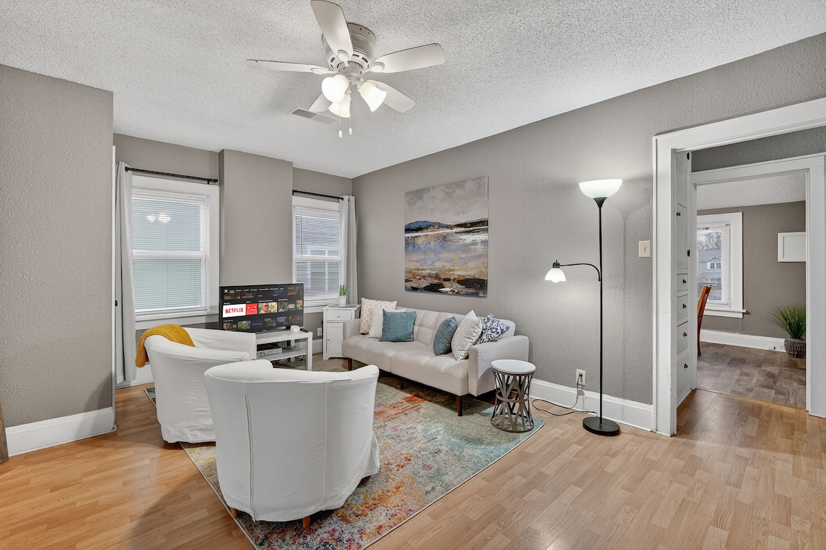 Disfruta de la comodidad en este espacioso apartamento de 3 habitaciones totalmente remodelado. Meticulosamente limpio y cuidadosamente diseñado, este alojamiento ofrece un entorno cómodo y práctico para tu estancia. Televisores en cada habitación que permiten que cada uno tenga su propia área privada. Ya sea que estés de visita por negocios o por placer, nuestro apartamento es el alojamiento perfecto. Esta propiedad está en el segundo piso y requiere que los huéspedes suban y bajen escaleras.