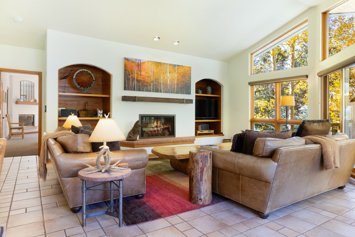 Este alojamiento de 3 dormitorios, 2 baños y un aseo tiene un diseño abierto que facilita la interacción grupal/familiar. Desde la sala de estar, las puertas de vidrio se abren a la terraza con jacuzzi. Desde la terraza y la sala de estar, las vistas a la montaña prevalecen en invierno y los altísimos álamos proporcionan sombra en verano. Una suite principal se encuentra a unos pasos por encima de la sala de estar y dos dormitorios se encuentran justo debajo del nivel de entrada. La terraza trasera que soporta el jacuzzi está en el nivel principal, justo fuera de la sala de estar principal.