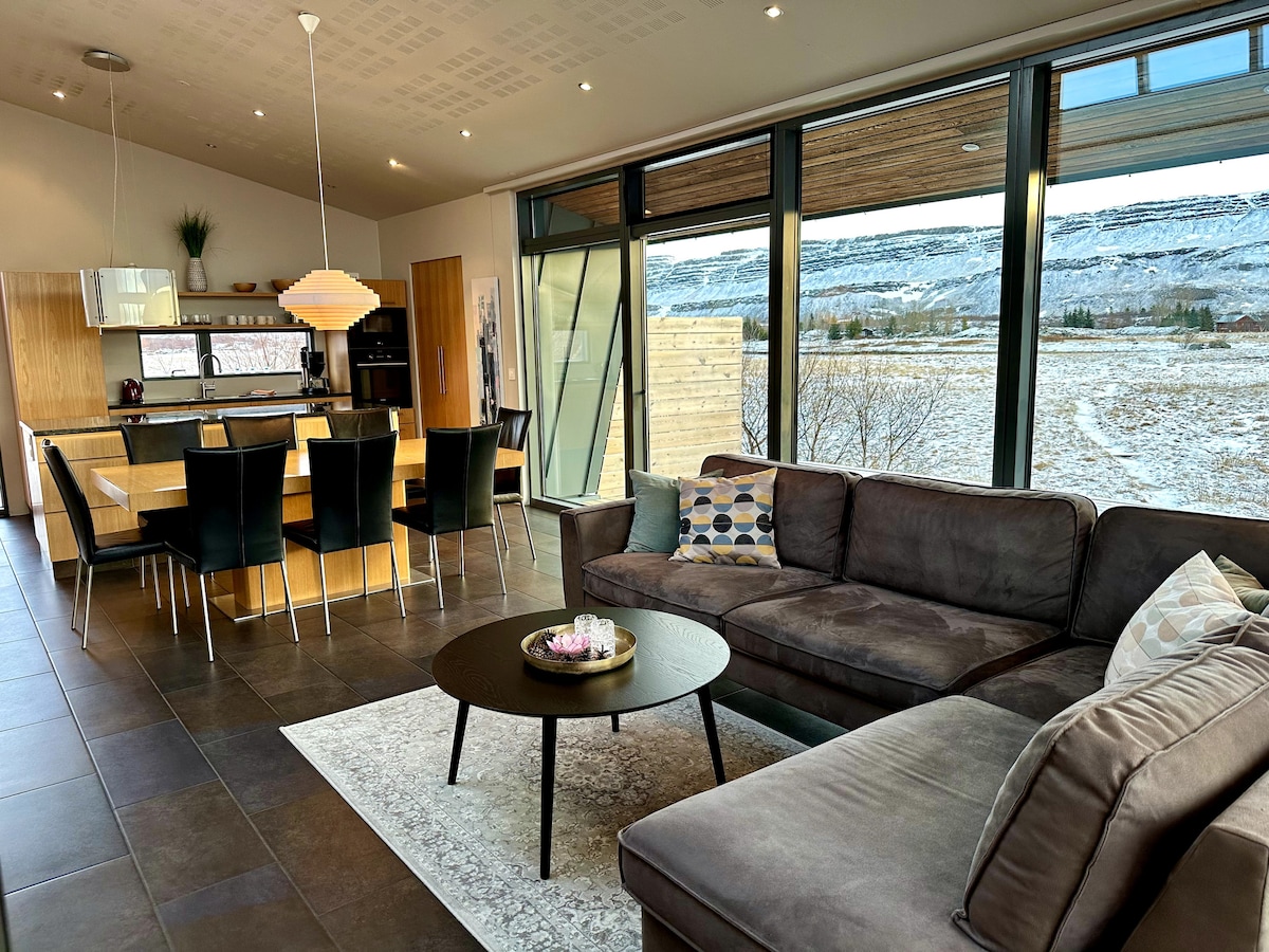 Nes es una casa de lujo en un paraíso natural de senderismo junto al río Norðurá. 4 dormitorios, 10 personas, 2 baños, jacuzzi, vistas al río y a la montaña, a poca distancia a pie de la cascada Glanni, el lago Hreðavatn y el cráter Grábrók. Muy cerca está la hermosa zona de Borgarfjörður y el Parque Nacional Snæfellsjökull. Palabras clave: vistas increíbles, moderno, jacuzzi, cráteres, piscinas naturales, cueva de hielo, glaciares, lago.