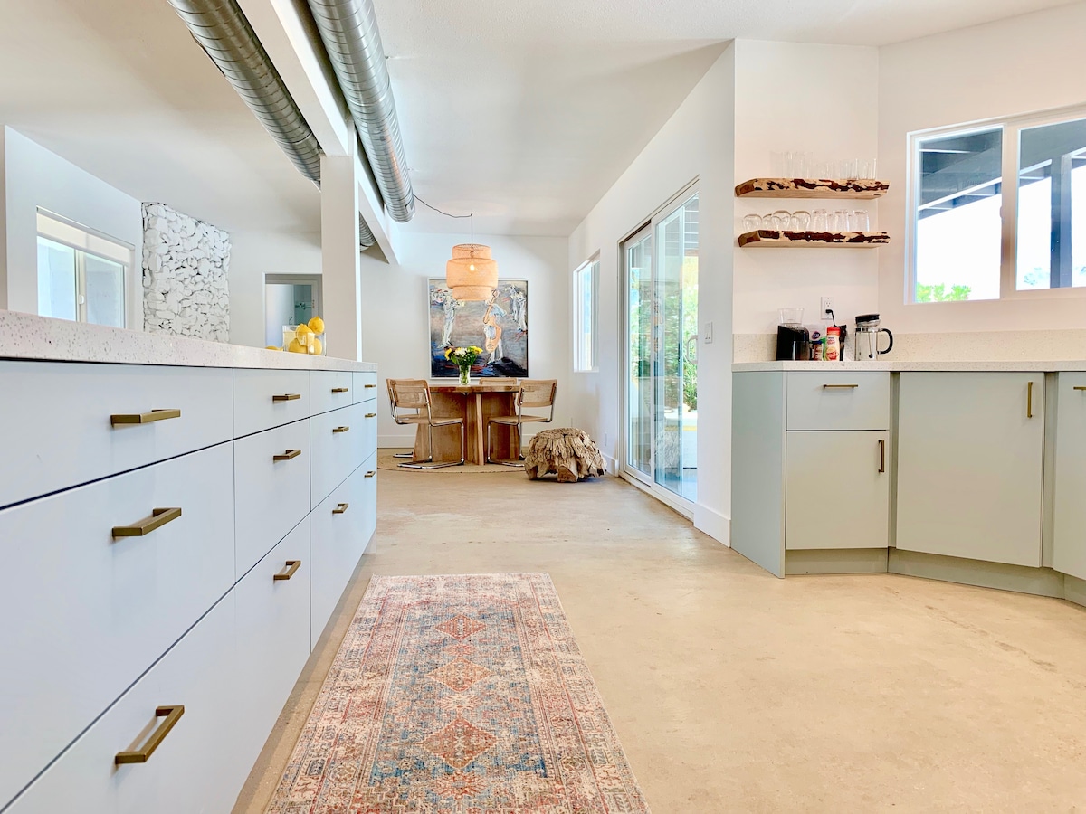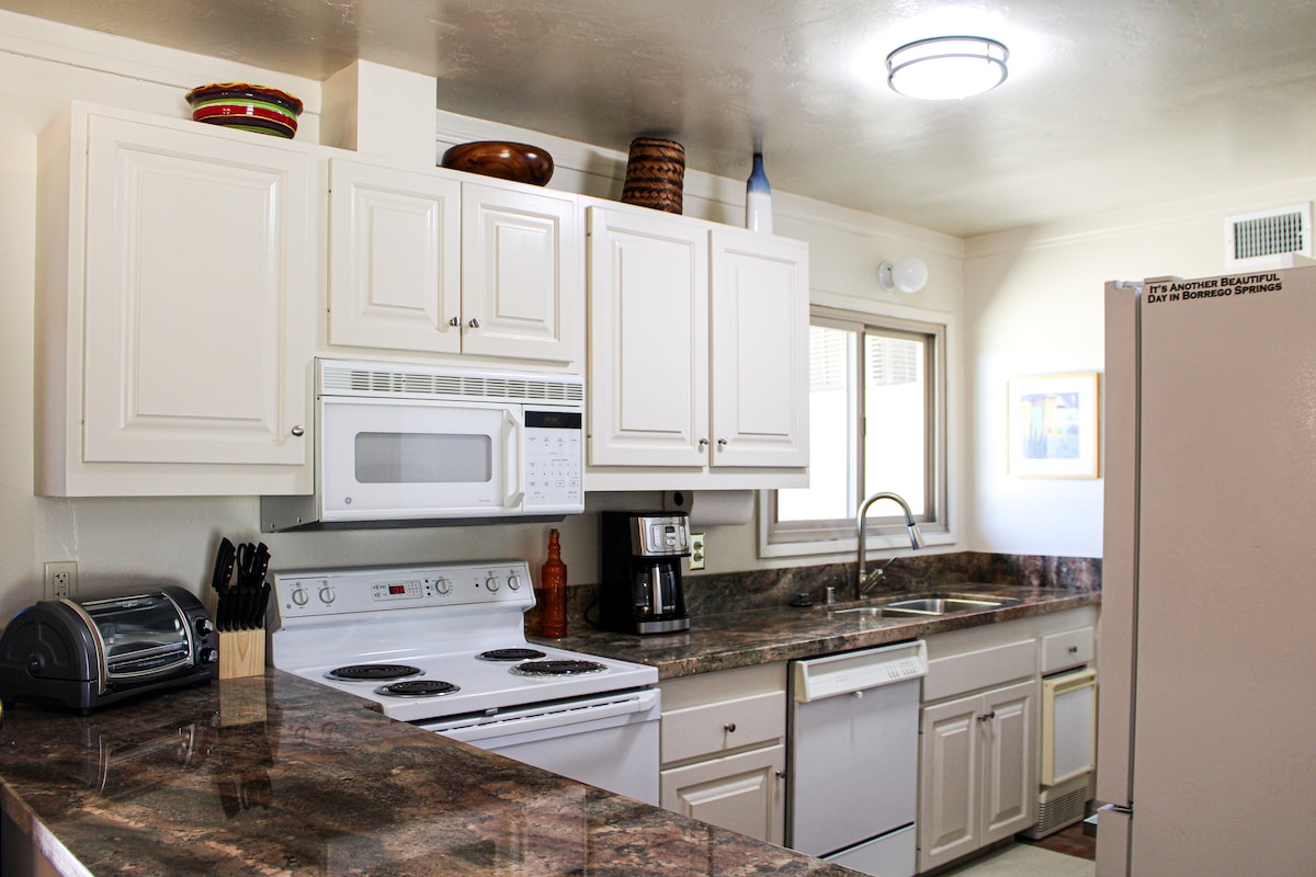 Este renovado refugio en el desierto, de estilo moderno de mediados de siglo, le espera con una cama tamaño king de primera calidad, lujosa ropa de cama de algodón, toallas, batas y una cocina bien equipada. Cerca de la ciudad (1/2 milla) con tiendas, restaurantes, campos de golf, piscinas, canchas de tenis y senderismo a pocos minutos. Explora el cielo nocturno en esta comunidad registrada de Dark Sky con telescopio proporcionado, aventura todoterreno en el Parque Estatal Anza-Borrego, camina por senderos locales o simplemente disfruta del paisaje montañoso circundante.