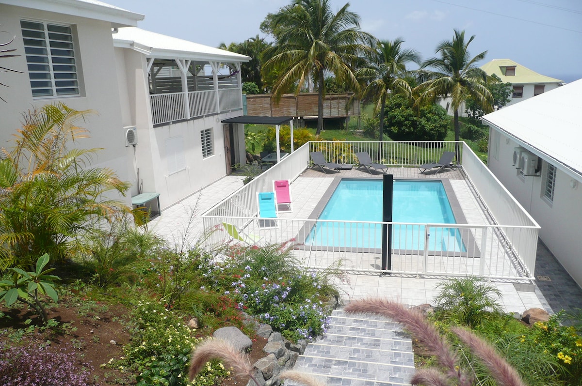 "CHOUETTE PARADIS", alojamiento en la parte baja de la villa, de una casa nueva, con vistas al mar Caribe y a los islotes de las palomas. En un extremo de la urbanización, tranquilo. Situada en el medio, entre el pueblo de Bouillante, con su fuente de agua caliente de la geotermia, y las tiendas de palomas + la playa de Malendure, donde se encuentran los clubes de buceo, esnórquel... de la reserva Cousteau. Le daremos la bienvenida, con una sonrisa y pequeños detalles.