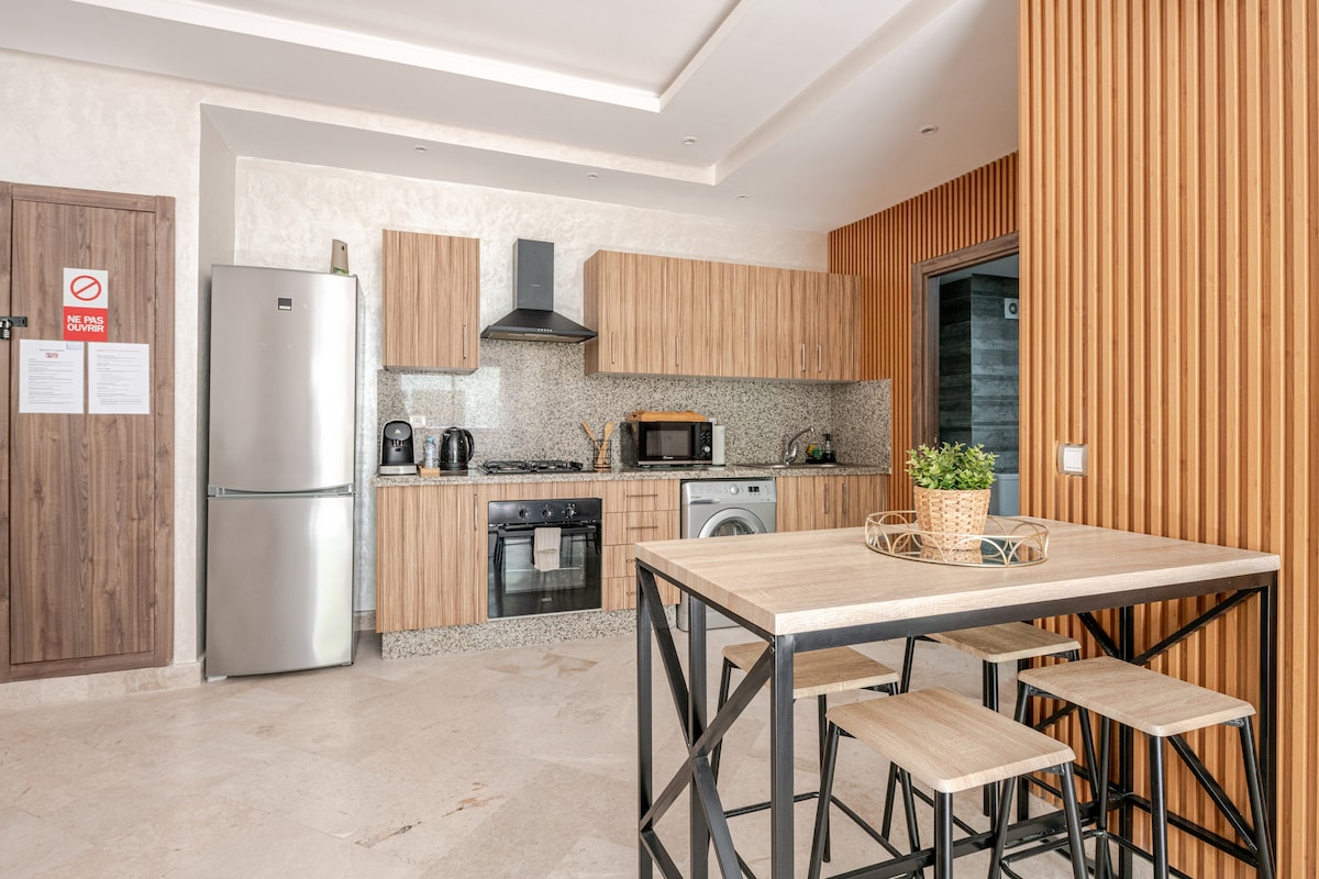 Disfrute de un nuevo alojamiento decorado y vivo en la ciudad de Mohammedia. Totalmente equipado y con una gran vista al mar desde la terraza orientada al SUR. El apartamento está en una residencia segura (24/24 H) en el corazón del parque de Mohammedia. - a 5 minutos andando de la playa - 2 KM de la estación de tren - 25 km de la mezquita Hassan II Este establecimiento pone a su disposición un ascensor, un servicio de seguridad y presentamos una facilidad de check-in y check-out gracias a nuestra cerradura conectada.