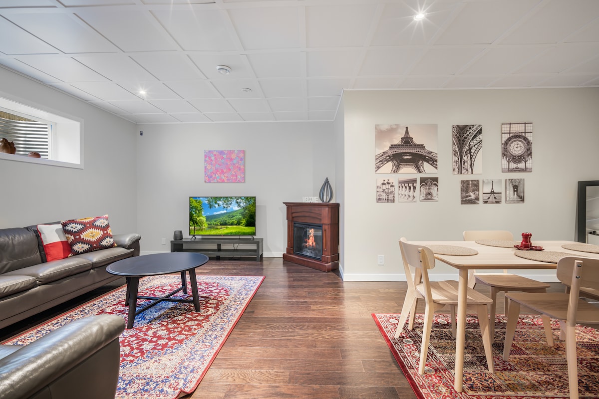 Relájate con toda la familia en esta tranquila y privada suite en el sótano. Disfruta de la comodidad de tu propia entrada independiente, una acogedora sala de estar, un dormitorio con una cama tamaño queen, lavandería en suite y vistas a un patio trasero bellamente ajardinado. La cocina pequeña está equipada con una placa de inducción, microondas y mininevera, perfecta para preparar comidas ligeras durante tu estancia. Ideal para viajeros solitarios, parejas o grupos pequeños: tiene capacidad para 4 personas.