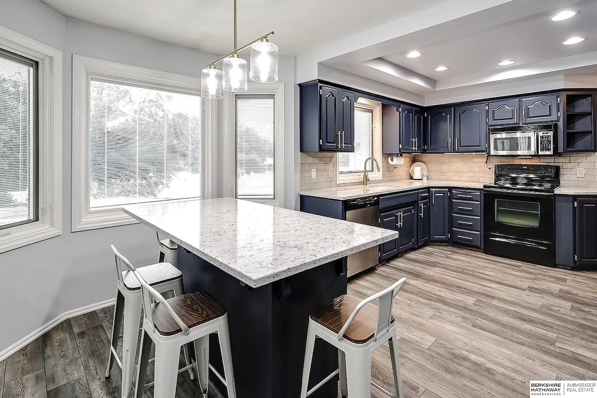 ~ Rancho de paseo con una bengala moderna de mediados de siglo, > 2000 pies cuadrados más un patio cubierto, porche cubierto y comedor al aire libre ~ Estacionamiento en el garaje para 2 vehículos + cargador para vehículos eléctricos ~ 1 milla de la autopista Dodge, que puede llevarte a cualquier lugar de Omaha en 10 a 15 minutos. ~ Cocina totalmente abastecida y equipada. ~ Barrio extremadamente seguro y apto para familias ~ Cerca de MUCHAS tiendas y restaurantes