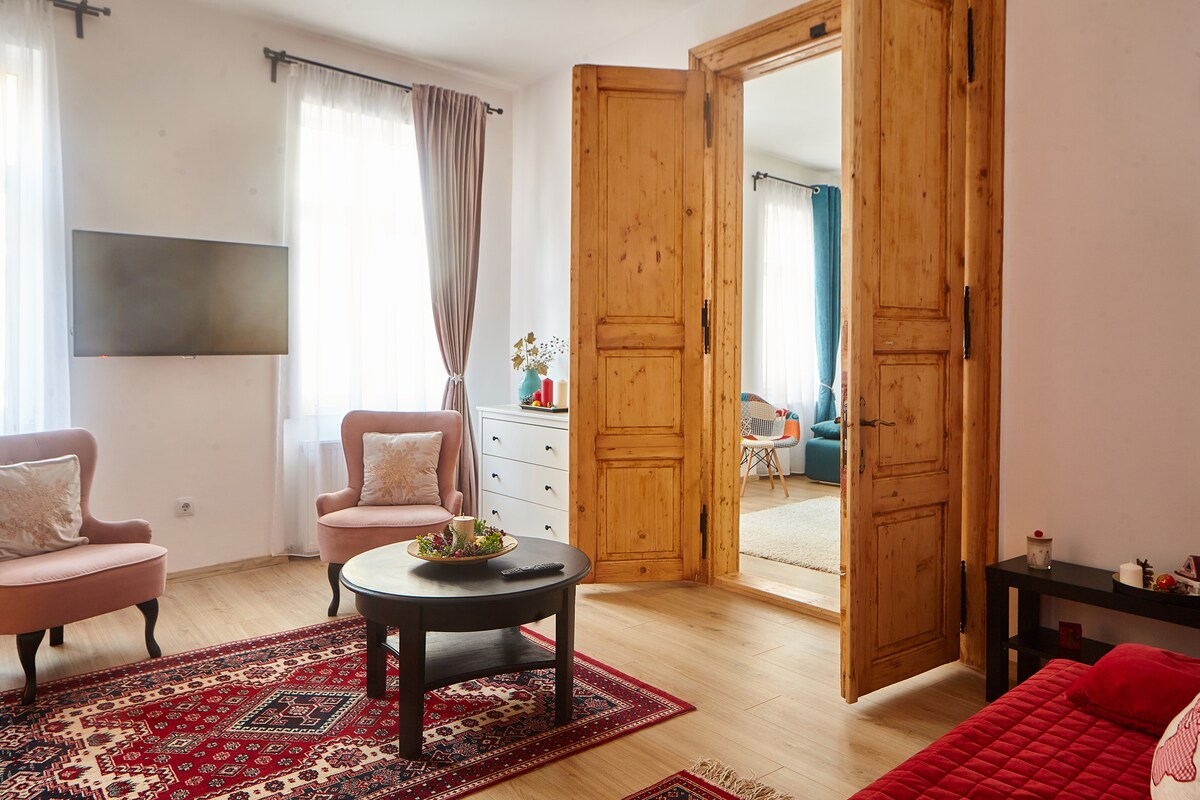 Siente la elegancia del Viejo Mundo en habitaciones con techos altos, suelos de parqué y características arquitectónicas de época. Las paredes negras y el arte abstracto añaden un toque moderno, mientras que otros detalles evocan el Art Deco. Sal al estrecho balcón para tomar un poco de aire fresco. El apartamento está a un minuto a pie de la famosa Piata Sfatului y del centro del casco antiguo. Camina un poco más lejos para ver la arquitectura gótica de la Iglesia Negra.