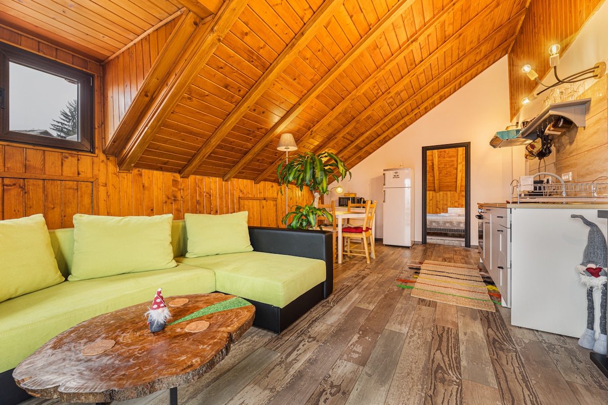 La cabaña tiene una hermosa sala de estar y una cocina totalmente equipada, así como una chimenea. Es extremadamente encantador, el lugar perfecto para disfrutar de la montaña. En el exterior hay un hermoso patio con una terraza al aire libre y una sala de estar para los huéspedes, una barbacoa. Un arroyo encantador atraviesa la propiedad. También hay un parque infantil, 2 hamacas, un columpio y una zona de relajación para adultos: jacuzzi climatizado (que se paga extra a petición). Es el alojamiento perfecto para unas excelentes vacaciones.