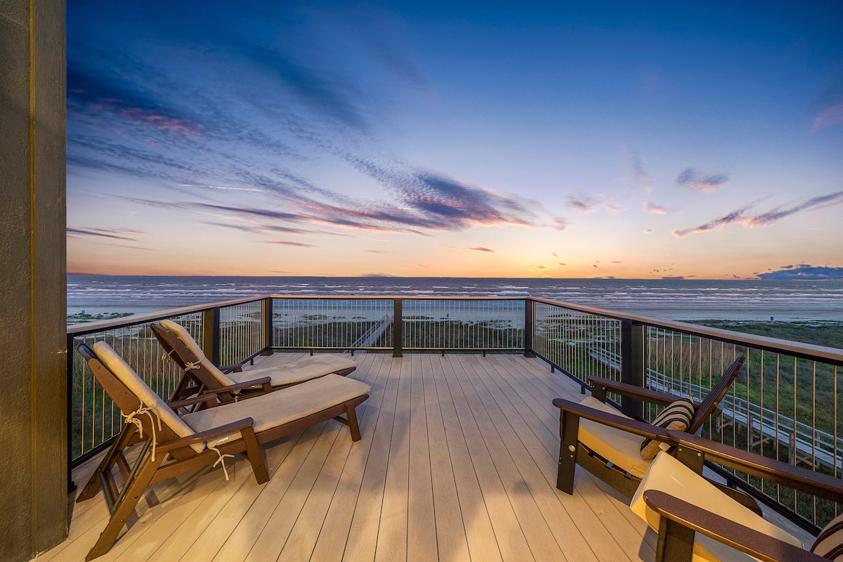 ¡NUEVA construcción frente a la playa! ¡Verdaderamente un unicornio:🦄 UBICACIÓN, LUJO y tan agradable tenerlo NUEVO! ¡Ubicado a pocos pasos de los mejores restaurantes y playa en Surfside! Disfruta de hamacas y juegos debajo de la casa. ¡Sube los escalones hasta una impresionante terraza sombreada con vistas desde San Luis Pass hasta el embarcadero! Vistas despejadas de 180 grados. Dormitorios abiertos a SunDeck y observación de estrellas con 🔥 fogata YouTube Beachfront Luxe para video ¡Tarifa de limpieza de $ 125 y solo $ 75 en total para un máximo de 2 mascotas para toda la estancia!