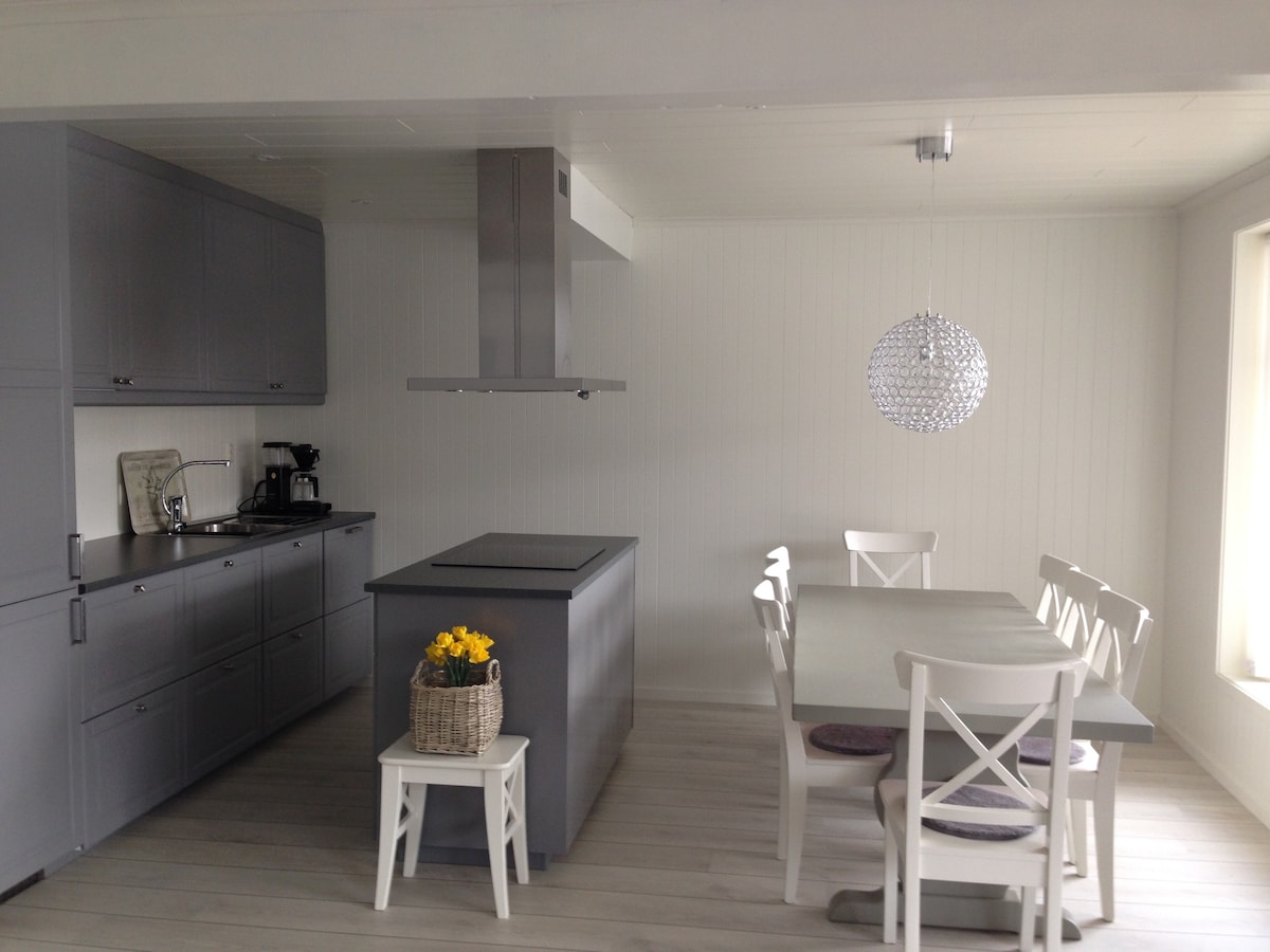 ¡Apartamento de 100 m ² con acceso en silla de ruedas con vistas únicas al acantilado marino más alto de Europa, Hornelen! Tiene un dormitorio con una cama doble y un sofá cama para dos, cocina, sala de estar, baño y su propia terraza. Hay buenas oportunidades de senderismo y pesca cerca. Los huéspedes tienen acceso a una zona de pesca y chimenea junto al mar. Las cañas de pescar se pueden alquilar y devorar para comprarlas. La leña se compra en la ubicación. Hamaca disponible sobre la casa, donde puedes disfrutar de la tranquilidad con una vista fantástica hacia Hornelen.